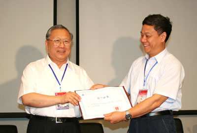 郭传杰宣读了《关于授予李佩同志“中国科学院教书育人特别贡献奖”的决定》,授予已故“两弹元勋”郭永怀的夫人、中科院研究生院李佩教授“中国科学院教书育人特别贡献奖”。路甬祥院长为李佩教授颁发了获奖证书和纪念杯(中科院研究生院党委书记邓勇代领)。