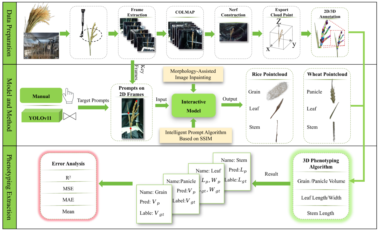 近期,中国科学院合肥物质院智能所黄河研究员团队提出了一种基于神经辐射场(NeRF)与Segment Anything Model 2(SAM2)融合的交互式无监督植物快速表型提取框架IPENS,实现了对水稻和小麦等作物多器官的高精度三维点云提取,显著提升了植物表型分析的效率与准确性。该研究成果已正式发表于植物表型学领域知名期刊Plant Phenomics(中国科学院一区TOP期刊)上。