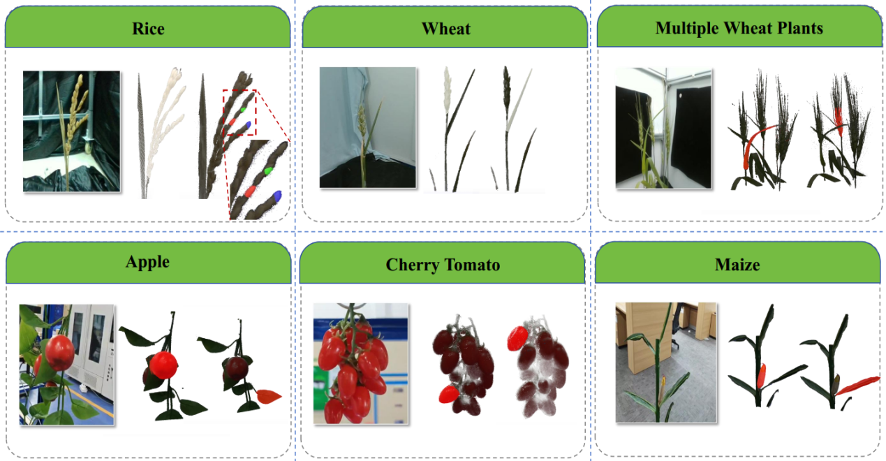 植物表型分析是现代智慧育种的核心技术之一。传统方法依赖大量人工标注数据,成本高、周期长,且难以处理遮挡严重的小目标(如稻穗、籽粒)。IPENS框架通过结合NeRF的高质量三维重建能力与SAM2的强大视频分割与传播能力,实现了无需标注、单轮交互、多目标三维点云同步提取。该方法在水稻数据集上实现了籽粒、叶片和茎秆的mIoU达63.72%,籽粒体素体积预测R²为0.77,叶片面积预测R²为0.84,叶片长宽R²约0.97和0.87;在小麦数据集上表现更为突出,mIoU达89.68%,穗部体积预测R²高达0.9956,叶片面积预测R²接近1.0,叶片长宽R²约0.99和0.92。整个提取过程仅需3分钟,极大提升了表型提取的时效性。IPENS框架还具备良好的跨物种能力,可适用于多种作物器官的提取任务,为智慧育种提供了高效、低成本、非侵入式的表型数据获取方案。