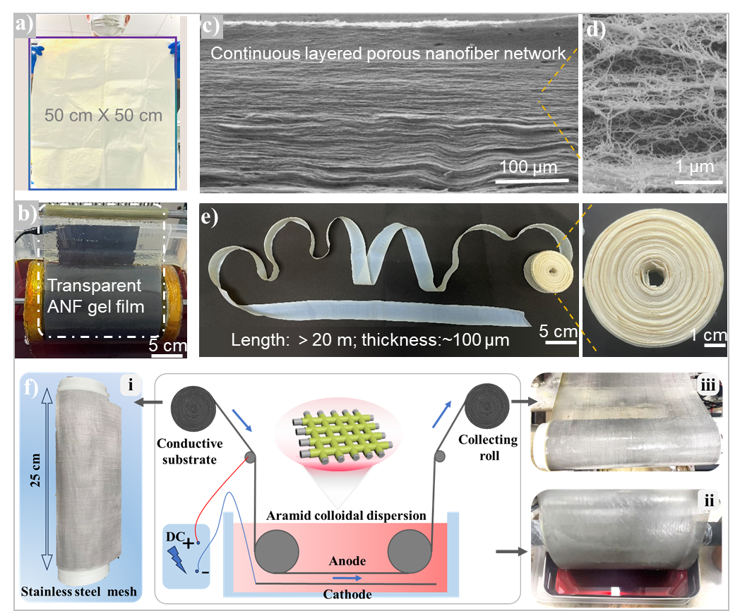 鉴于此,中国科学院苏州纳米技术与纳米仿生研究所张学同研究员团队提出了一种电场操控(Electro- manipulating,EM)新策略,结合电泳组装与电化学凝胶化技术,实现对带负电芳纶纳米纤维运动、取向及凝胶化过程的精准控制,从而制造出结构明确的微/宏观芳纶胶体气凝胶薄膜(图1)。该工作以Electro-manipulating of negative-charged aramid nanofibers towards micro-to-macro scale colloidal aerogel films为题发表在Nature Communications上。