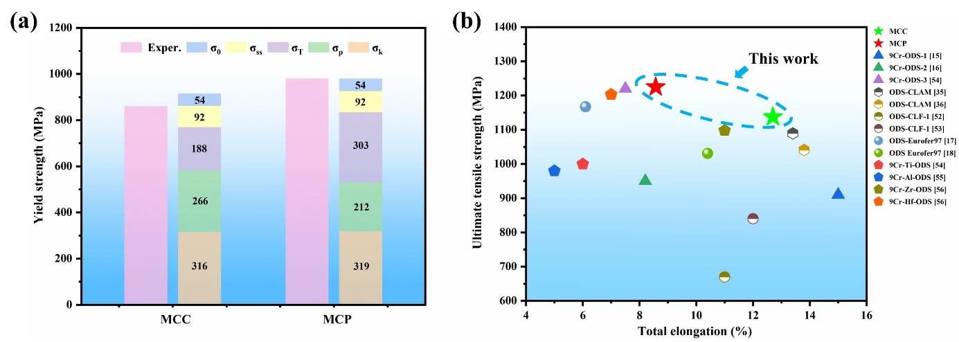 (b) 与参考文献中回火9Cr-ODS钢性能比较