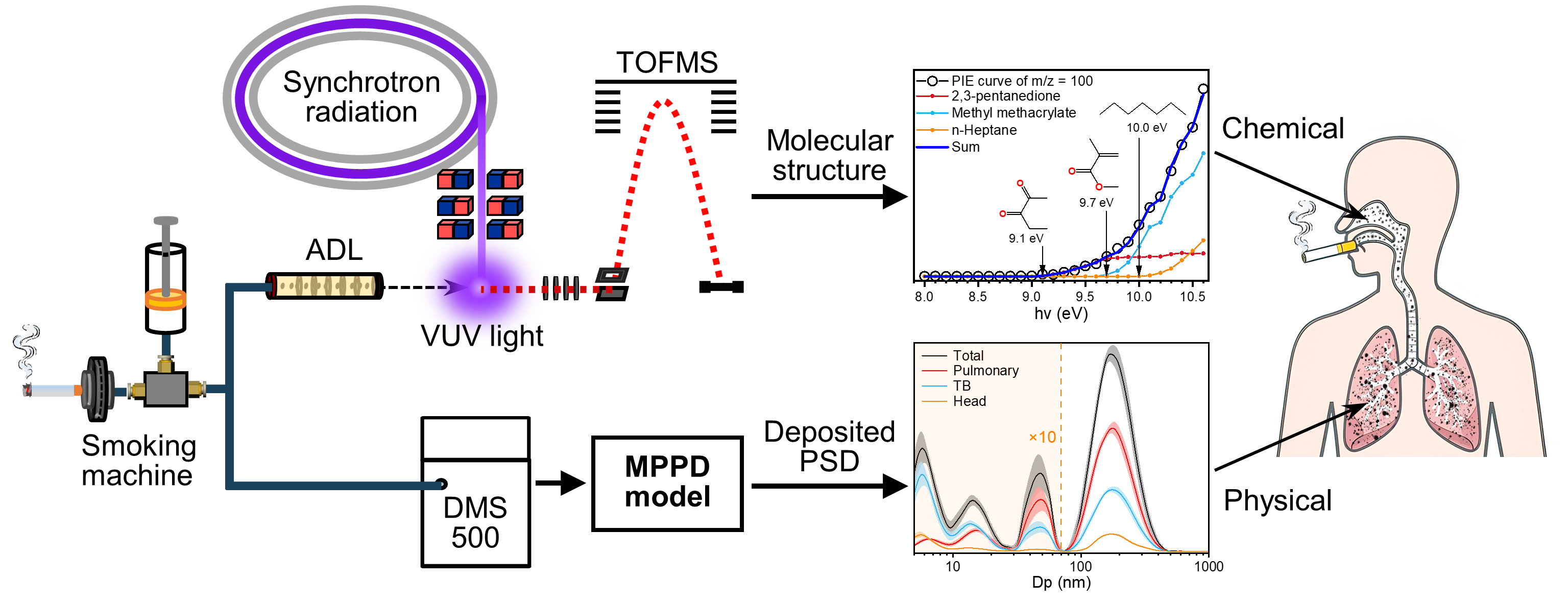 卷烟烟气气溶胶对人类健康构成严重威胁,其粒径、浓度及化学组成是影响暴露风险的核心因素。研究人员采用快速响应粒径分析仪(DMS500)和多路径颗粒剂量沉积模型(MPPD),依托自主研制的高性能真空紫外光电离气溶胶质谱仪(VUV-PIAMS),结合合肥同步辐射光源,实现了卷烟烟气气溶胶从粒径分布表征到分子结构探测的全面分析。