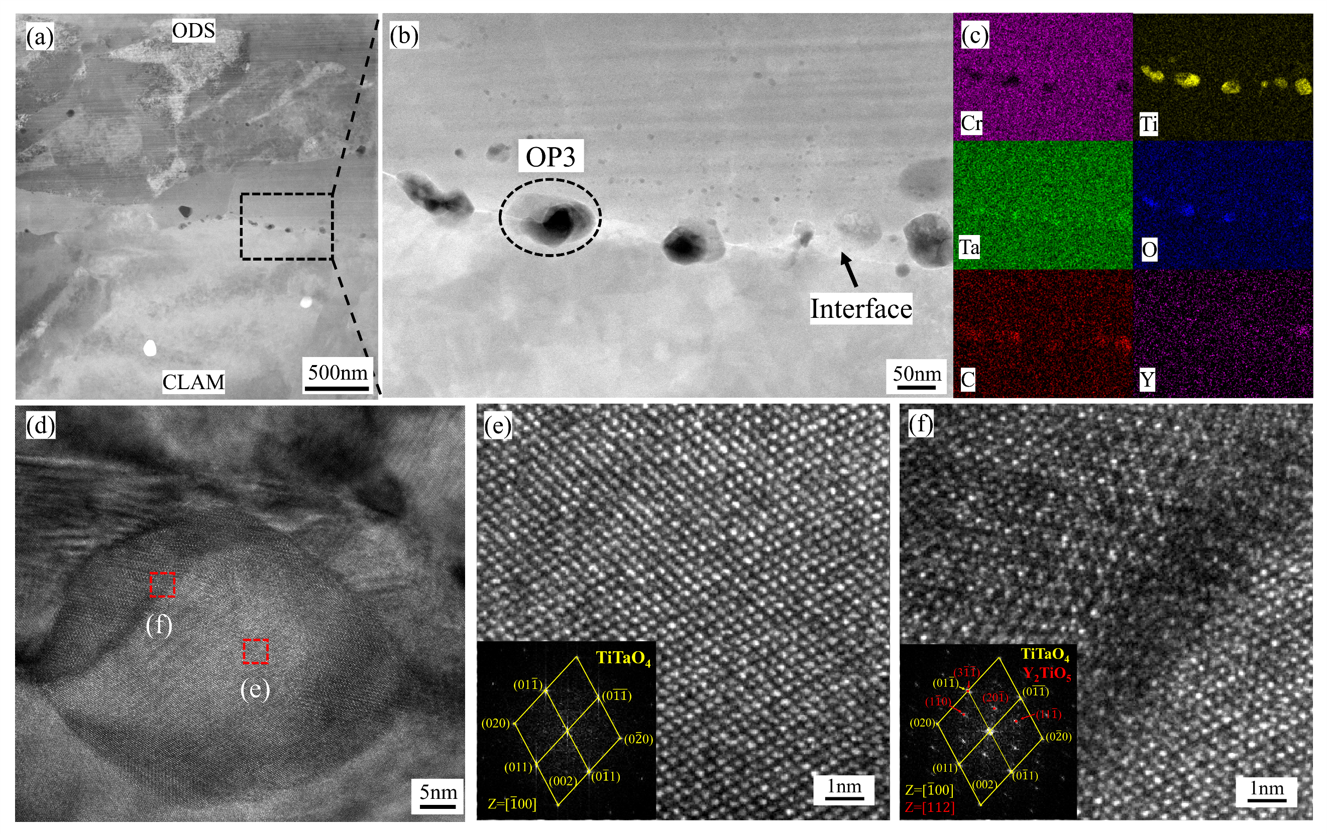 传统熔焊技术易导致ODS合金中纳米氧化物的分解与粗化,严重影响接头性能。为解决该难题,科研人员创新采用热变形连接这一固态连接技术,系统研究了1050℃下不同变形量对CLAM钢与9Cr-ODS合金界面组织与氧化物的影响规律。结果表明,界面氧化物的成分、尺寸与形貌随变形量增加发生显著转变。5%变形量下存在的粗大Cr-Mn-Ti复合氧化物随变形增大逐步分解,并转变为更稳定的TiTaO₄氧化物;在30%变形条件下,进一步形成独特的“核-壳”结构氧化物,最终实现界面氧化物的完全纳米化。同时,原始平直界面被动态再结晶晶粒取代,实现界面完全冶金愈合。接头性能评估表明,在10%变形条件下,连接接头的拉伸性能与CLAM钢母材相当,显示出优异的连接质量与可靠性。该研究通过热—机械协同作用,成功将脆性界面氧化物转化为有益纳米相,为高服役性能核部件的制造提供了新的技术路径与科学依据。