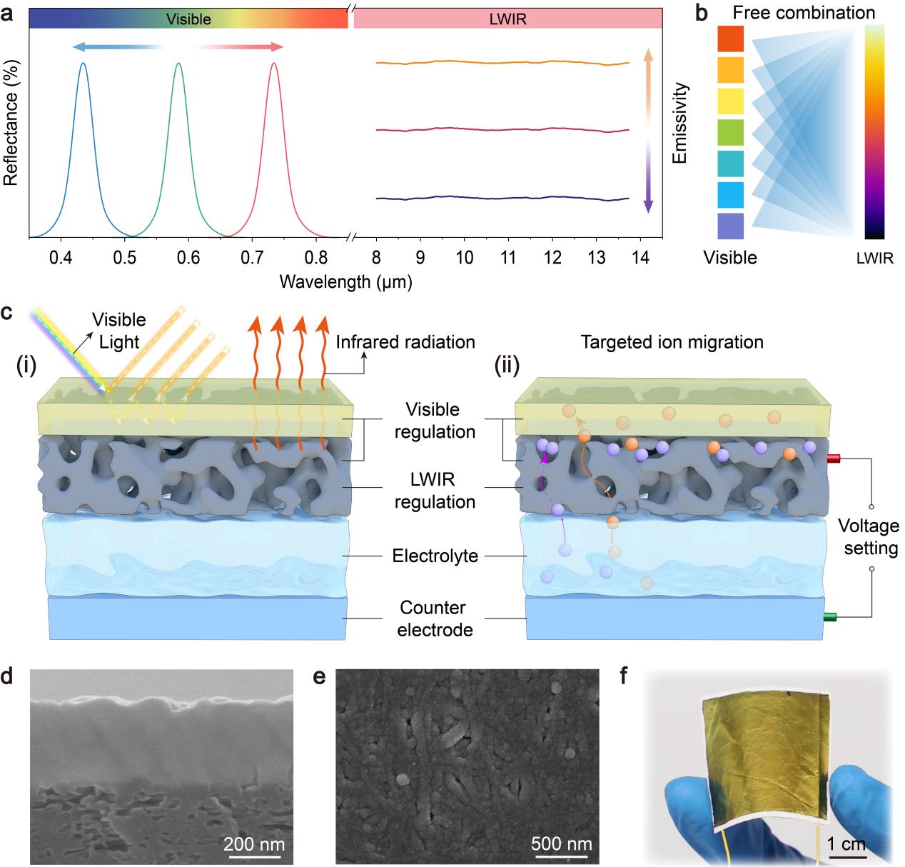 中国科学院苏州纳米所研究团队提出了一种新型光谱解耦调节器(SDR),它基于可电化学重构的双层谐振腔结构,分别采用对离子响应特性不同的材料作为介电层和反射层。通过调控电压,实现离子定向迁移至不同功能层,调控材料光学属性,从而分别调控可见光颜色与红外发射率,达到“可见色-红外发射率自由组合”的效果。