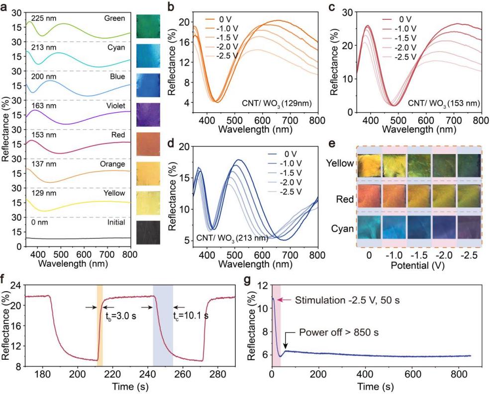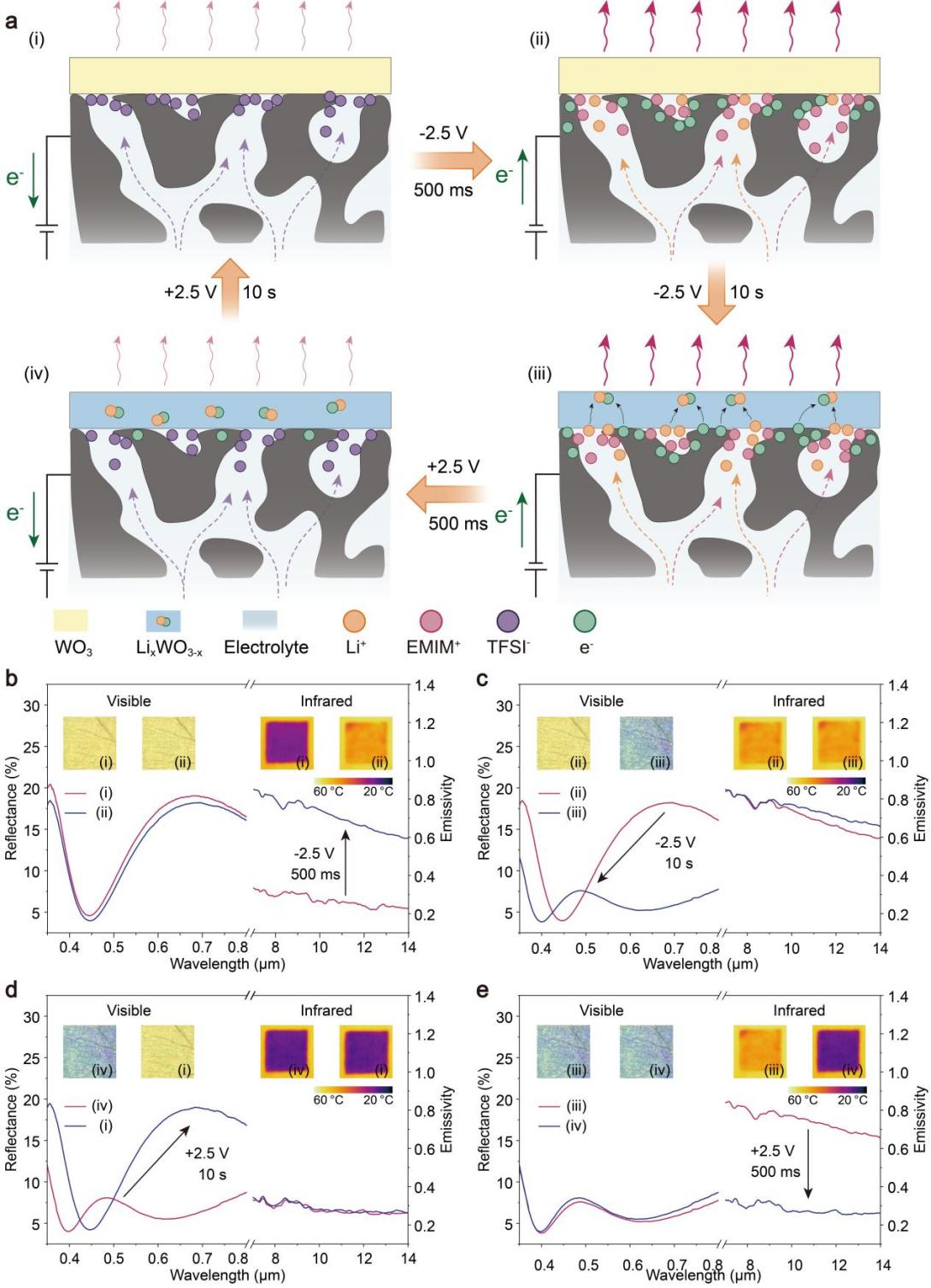 研究人员选用氧化钨(WO3)作为上层介电层/可见颜色调控功能层,并保持对长波红外透过;选择梯度致密化碳纳米管薄膜作为下层反射层/红外调控功能层。静态时,氧化钨和梯度致密化碳膜的反射表面构成布里-珀罗(FP)谐振腔,可以形成丰富的结构色(黄、橙、红、紫、蓝、青、绿等);当施加电压时,利用离子穿过梯度致密化碳膜内部的多孔结构到达不同功能层的电化学过程,可实现颜色的大幅度且精细调控(红色→橙色→绿色等),可实现红外发射率的大幅度调控(ΔLWIR =0.57)。有趣的是这两个过程相互独立,从而使单一表面可见光和热红外特征的解耦调控和自由组合成为可能。文章对上述现象背后的机制进行了详细研究,发现两种功能层对离子响应的特性不同,其发生反应的时间有着数量级的差别。例如,可见光颜色切换时间(着色/褪色)约为10.1 s /3.0 s,而红外发射率的高/低调制切换时间则在毫秒量级(342 ms/132 ms)内完成,因此在保持任一可见光颜色的同时,可独立调控其红外辐射率,反之亦然。