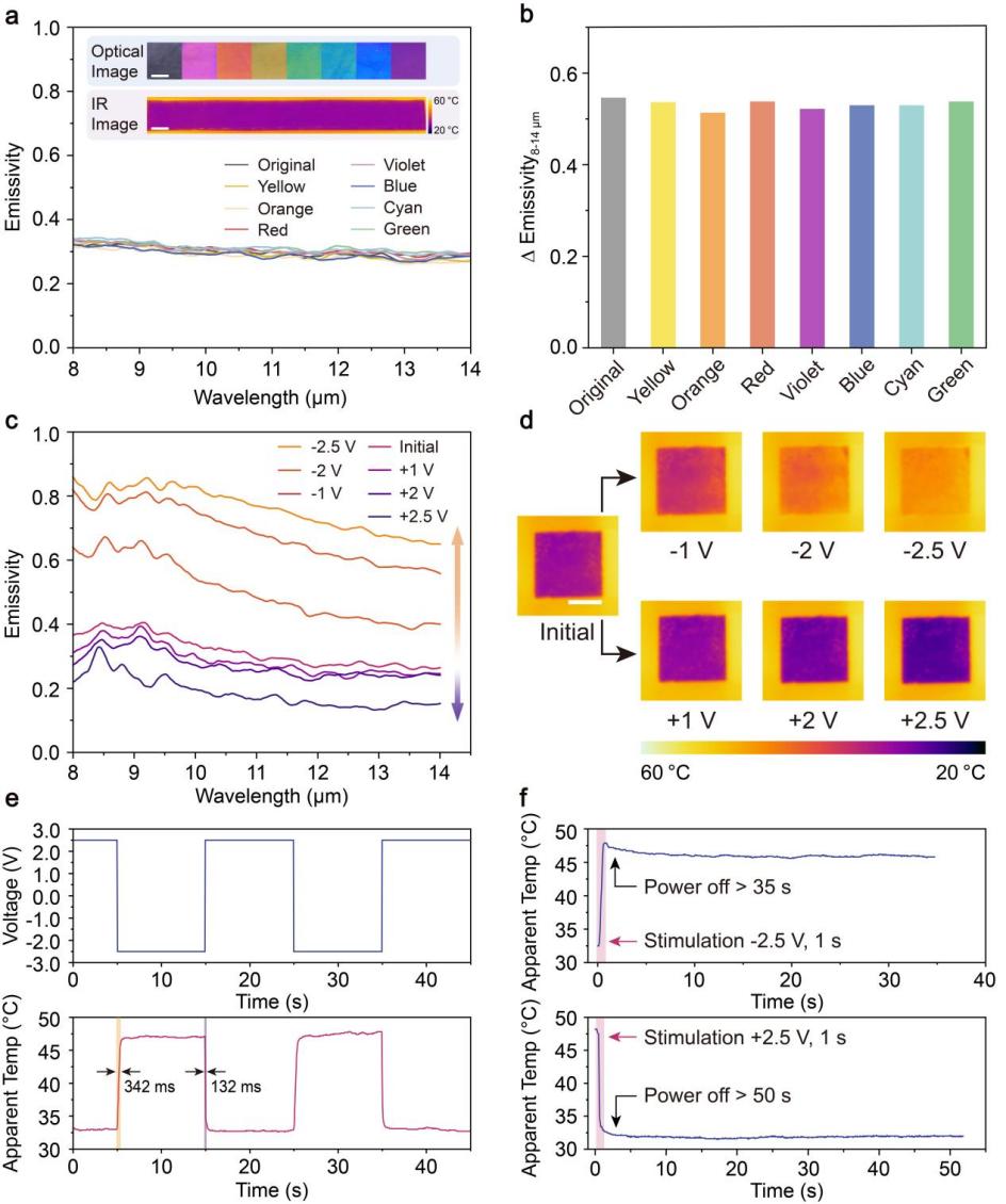 在智能光热管理和多波段光谱调控等前沿领域中,亟须对电磁波谱中可见光和长波红外等非相邻波段进行独立控制。然而,现有的大多数电致变色体系中,可见光颜色和红外发射率的调控往往是同步的、相互耦合的,这极大地限制了其在光热管理等复杂场景下的应用。
