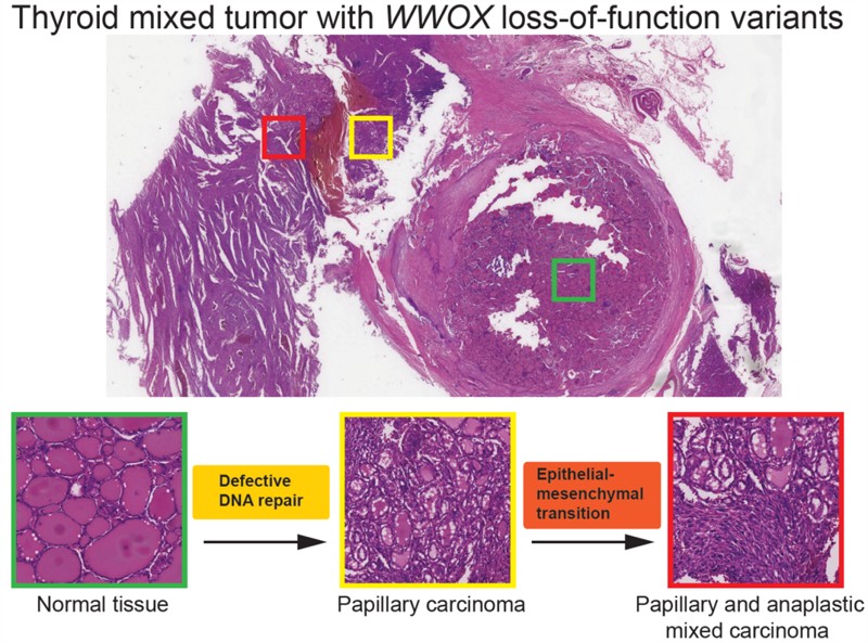 图:WWOX胚系失活突变是甲状腺癌的一个关键驱动因子,其通过削弱DNA损伤修复并激活EMT,促进肿瘤的发生与发展。