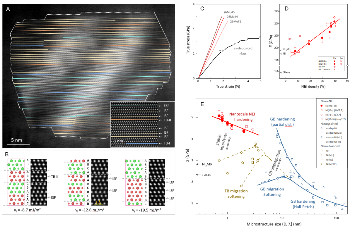 图 通过在镍基过饱和固溶体合金中构筑极高密度稳定的“负能界面” (A, B), 有效阻碍位错及界面运动,完全抑制塑性变形,显著提升杨氏模量(C, D),提升材料强度接近理论极限