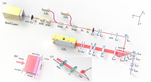 OHₓ自由基检测需308nm波段的单频激光激发,该波段依赖光学参量放大器(OPA)实现高效波长转换。然而 OPA 高性能泵浦源的缺失成为提升检测灵敏度的瓶颈之一。现有泵浦源方案中,单频连续种子源经过脉冲调制后功率衰减、全光纤放大器高峰值功率下易产生非线性效应且损伤阈值较低、传统全固态放大器小信号增益较弱,多级放大架构则存在系统冗余与单级增益不足的问题,均无法更好地满足OPA对泵浦源在紧凑性与高单脉冲能量方面的双重需求。