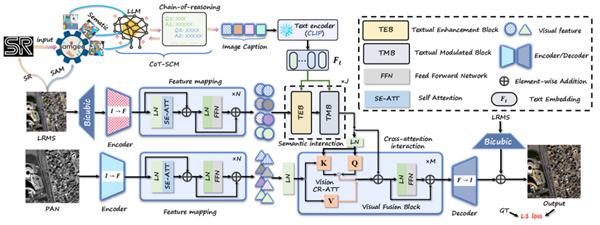 遥感图像全色锐化技术旨在融合低分辨率的多光谱(LRMS)图像与高分辨率的全色(PAN)图像,以生成兼具高空间分辨率和丰富光谱信息的遥感影像。尽管由文本引导的多模态学习方法在自然图像领域已经取得了显著进展,但由于全色锐化领域多模态数据集的缺乏,以及遥感场景的复杂性等问题,为语义信息的准确提取带来了巨大挑战。