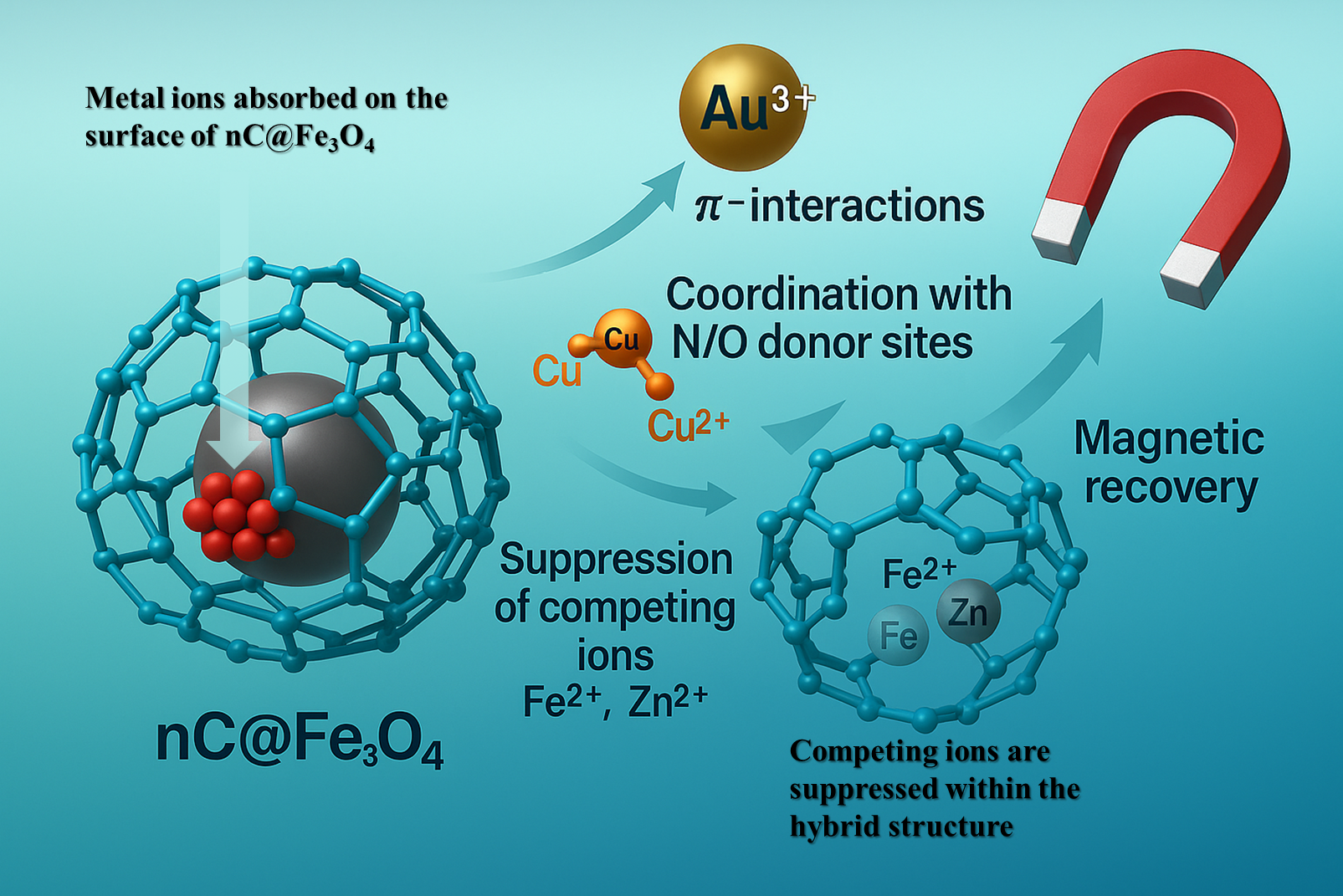 nC@Fe₃O₄ 复合材料对金属离子的吸附示意图