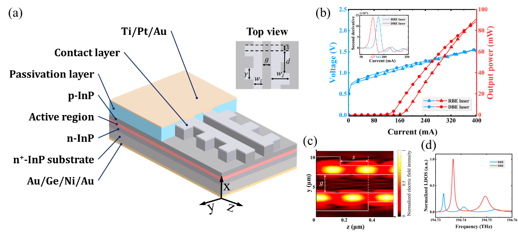 图1. 带边兼并激光器(a)结构示意图;(b)LIV特性;(c)电场分布;(d)光局域态密度