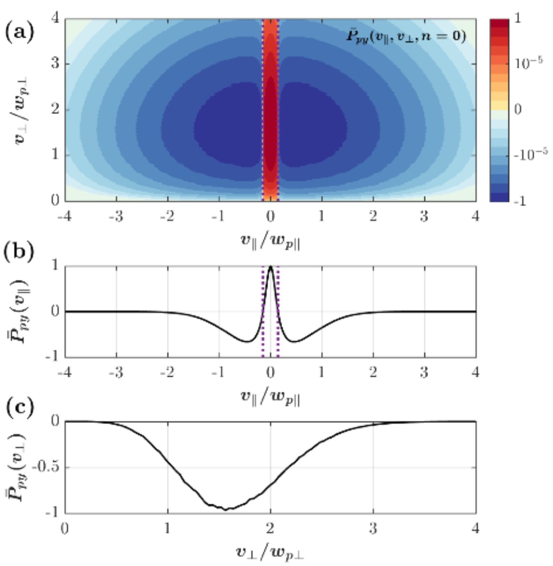 研究团队提出一套能够同时定量分析共振与非共振波粒相互作用的理论。基于该理论,团队对镜像不稳定性中的波粒能量转移过程进行了定量研究,首次揭示了速度空间中波粒相互作用的完整图像(见图1)。研究发现:在较小平行速度区域,共振粒子主导能量转移并吸收波动能量;而在较大平行速度区域,非共振粒子起主导作用,并将能量转移给波。据此,团队指出镜像不稳定性的能量过程为:非共振粒子释放自由能,镜像模与共振粒子获得能量。这一结论更新了以往的理论认知。