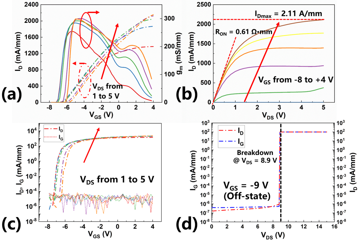 研究团队通过将源漏极欧姆接触区域延伸至栅极边缘,并采用n⁺⁺-GaN二次外延技术,有效抑制了常规器件中由栅控2DEG区域引入的接入区电阻,进而显著提升了器件的输出特性。该器件在550 nm栅长下,实现了2.11 A/mm的饱和电流密度、300 mS/mm的峰值跨导以及0.61 Ω·mm的低导通电阻,欧姆接触电阻低至0.09 Ω·mm