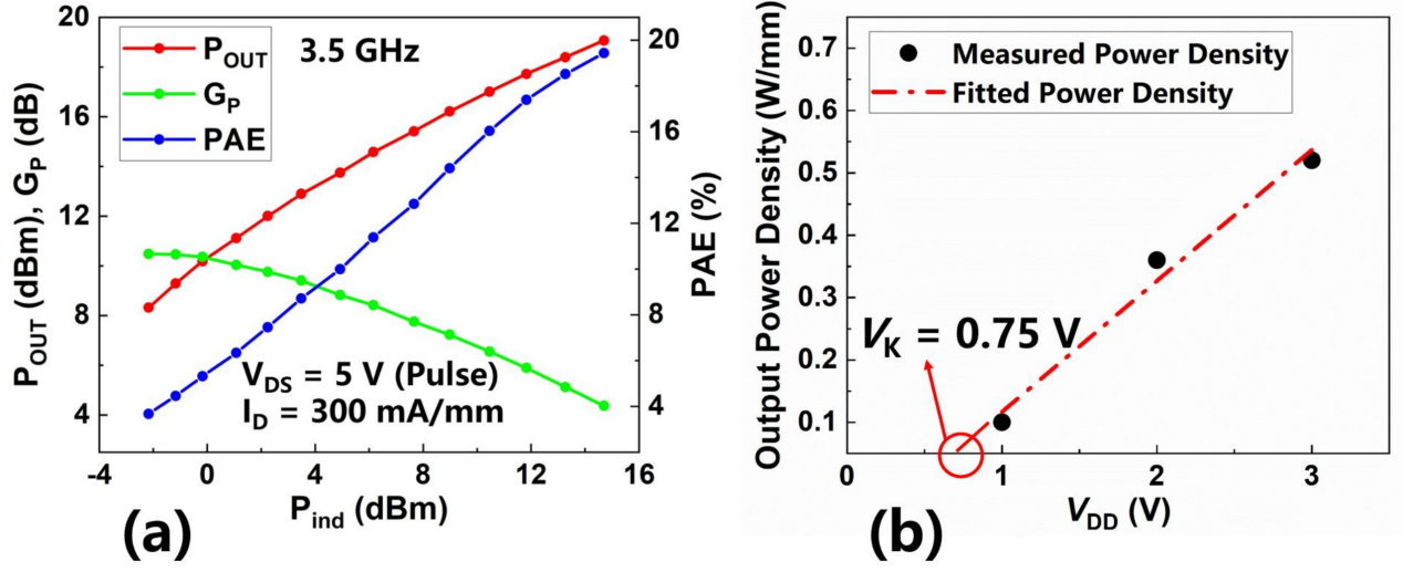 硅基氮化镓近无接入区MIS-HEMT器件结构(a3.5 GHz下基于负载牵引测试的射频功率特性(b)膝点电压外推结果