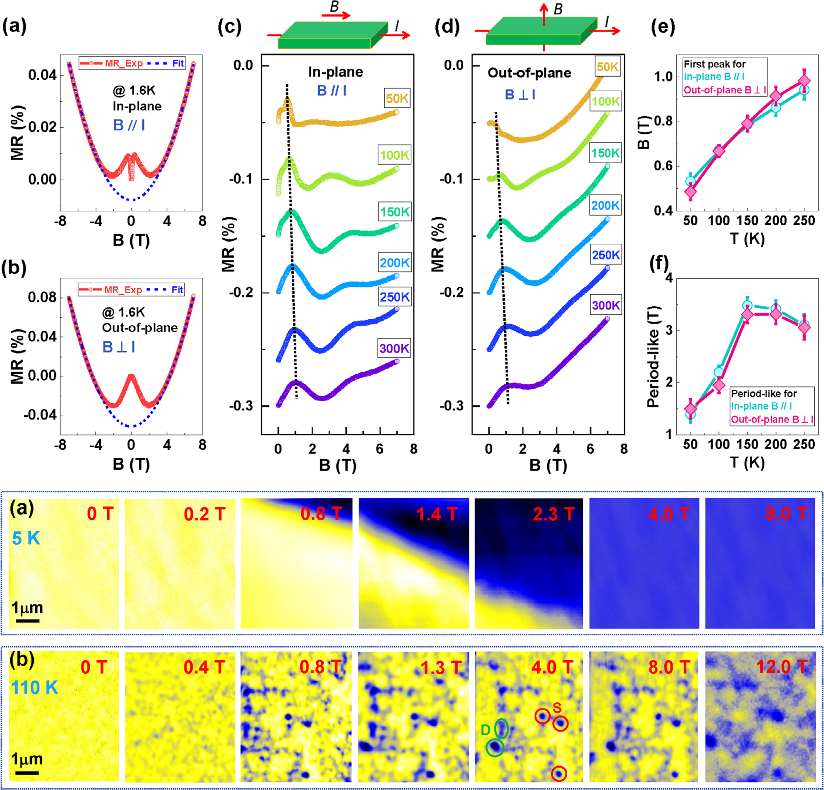 宏观电输运测量显示特定厚度FeSn/Pt异质结在低磁场范围出现了不同于传统Shubnikov–de Haas 振荡的非常规的、具有阻尼特征的震荡型磁阻。SHMFF微观MFM实空间成像直接揭示该反常磁阻现象与异质结中的多样化拓扑磁结构密切相关,证实了反铁磁拓扑自旋纹理与磁输运性质之间的内在联系。