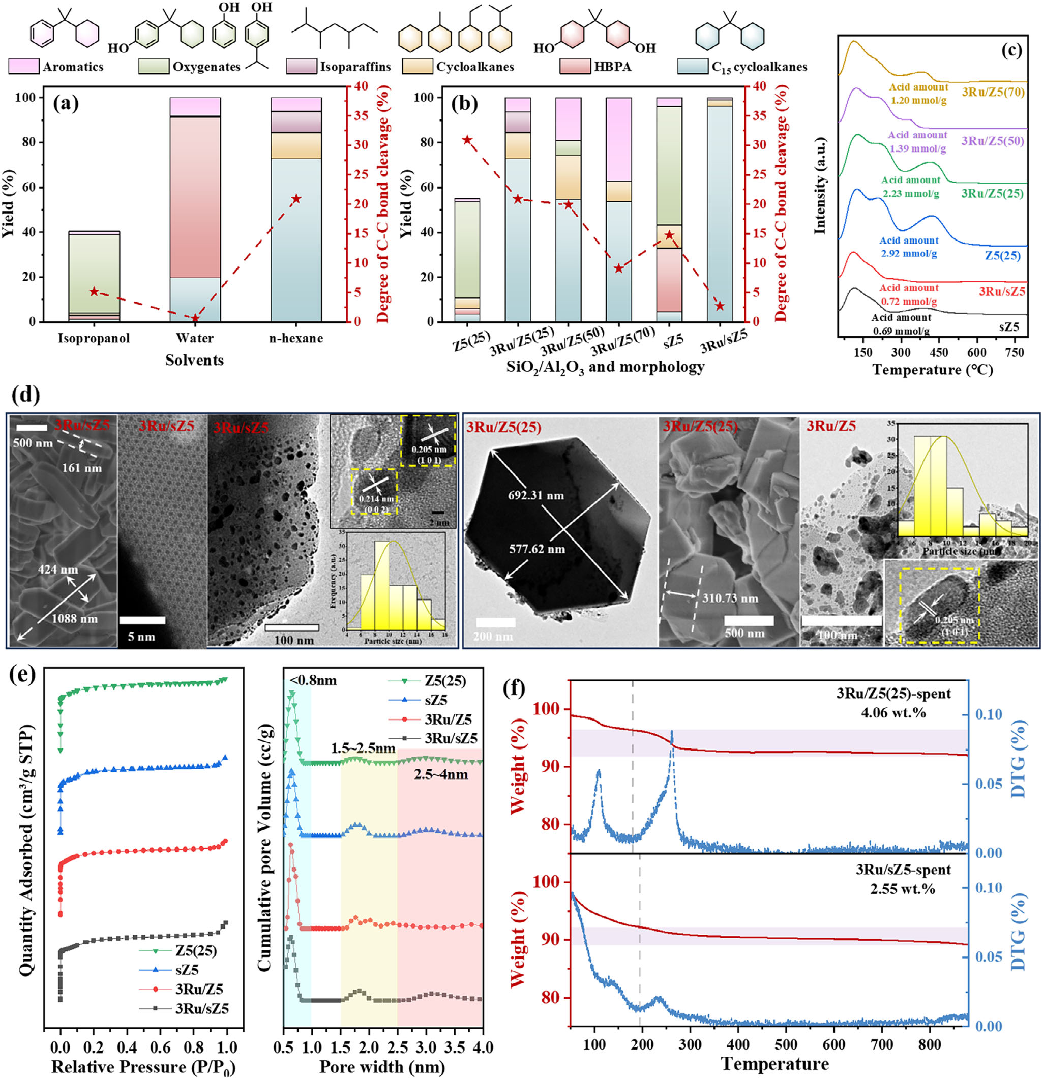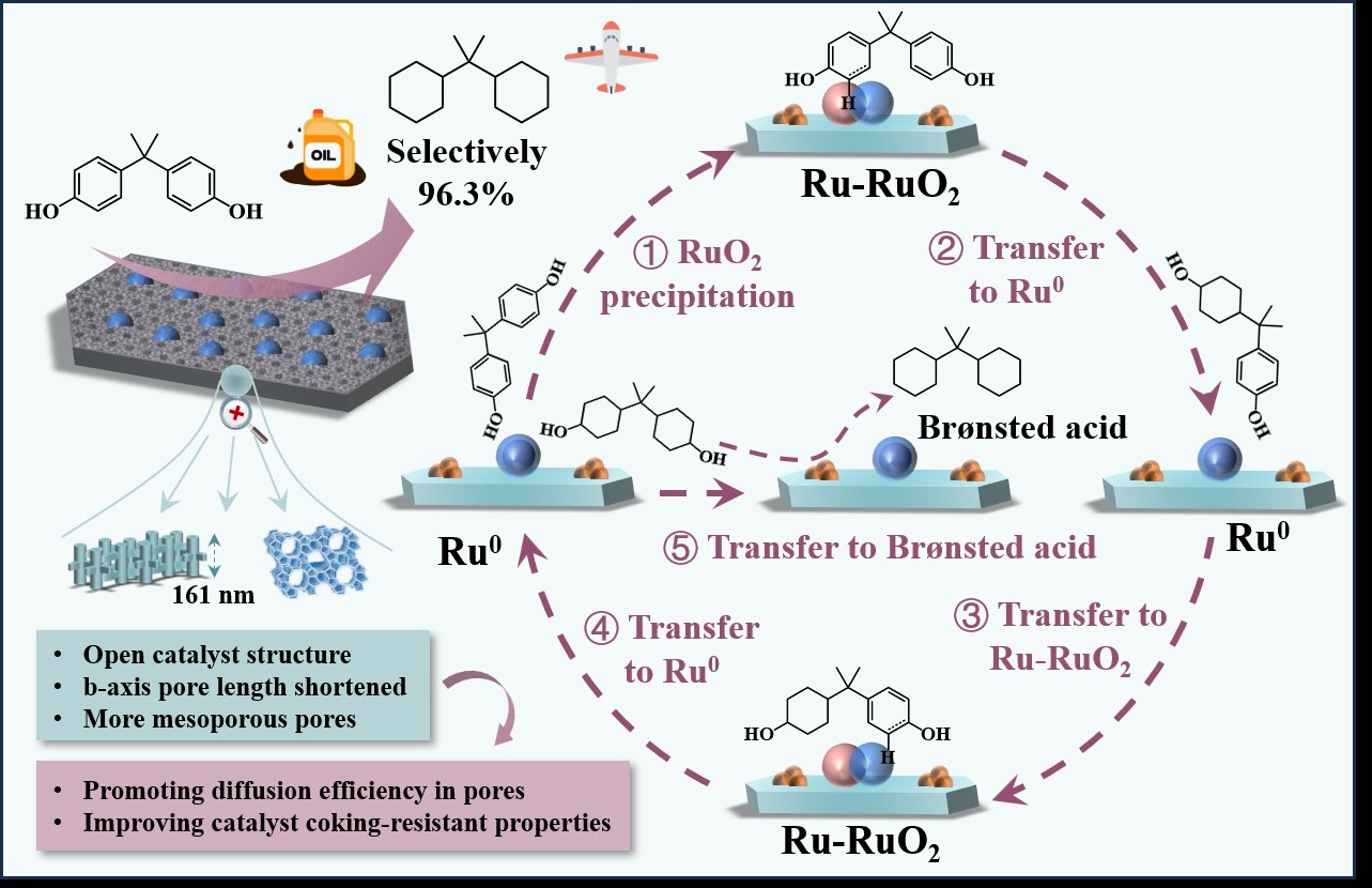 目前,废旧风机叶片、线路板中环氧树脂热解衍生的高碳数酚类难以高质利用。将高碳数酚类化合物(如双酚A)加氢脱氧为多环烷烃能有效提升燃料的能量密度,但该过程面临着抑制C-C键断裂和催化剂结焦的挑战。传统的微孔分子筛由于对大分子的传质能力有限,容易促进孔内发生二次副反应并导致结焦。为解决这一问题,研究团队设计并制备了一种负载钌的短介孔纳米片ZSM-5催化剂,该结构显著提高了反应物与金属/酸性位点接触的可及性,并加速了高碳数酚类物质的扩散。实验结果表明,该独特的纳米片结构结合适宜的布朗斯台德酸度,实现了由双酚A向2,2-二环己基丙烷的高效转化,产率达96.30%,同时有效抑制了C-C键的断裂和催化剂结焦。此外,研究团队利用环境透射电镜捕捉了Ru金属在原子尺度的瞬时变化,并结合密度泛函理论计算,揭示了其在不同加氢反应阶段的动态演变规律。该加氢脱氧(HDO)策略及机制探究为抗结焦催化剂的设计及在高碳数酚类化合物HDO过程中避免C-C键断裂提供了新思路,可广泛应用于废树脂和木质素热解产物的高效转化。