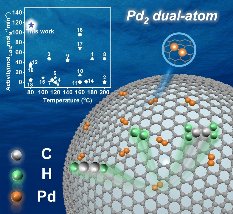 乙烯作为年产量超2亿吨的大宗化学品,广泛应用于聚烯烃工业。目前乙烯主要来源于石脑油蒸汽裂解工艺。该工艺所得的富乙烯原料气中含有少量的乙炔(0.5-3%)杂质会严重毒化下游乙烯聚合的Ziegler-Natta催化剂,导致催化剂寿命以及产品质量降低。工业上主要是通过乙炔半加氢工艺对富乙烯原料气进行净化,脱除乙炔。然而,由于乙烯过度加氢生产乙烷在热力学上更具优势,导致乙炔半加氢反应表现出高活性和高乙烯选择性难以兼得。目前,金属Pd纳米颗粒催化剂虽具有优异的乙炔加氢活性,但乙烯选择性极差,原料气中乙烯被大量消耗生成廉价的乙烷。金属Pd单原子催化剂由于活性位点的孤立分散,展现了优异的乙烯选择性;但是由于偏氧化态的Pd单原子上氢气解离活化能力较差,同时由于反应物分子间的竞争吸附,导致金属Pd单原子上乙炔半加氢的活性低。因此,开发高活性高选择性的乙炔半加氢催化剂仍面临巨大挑战。