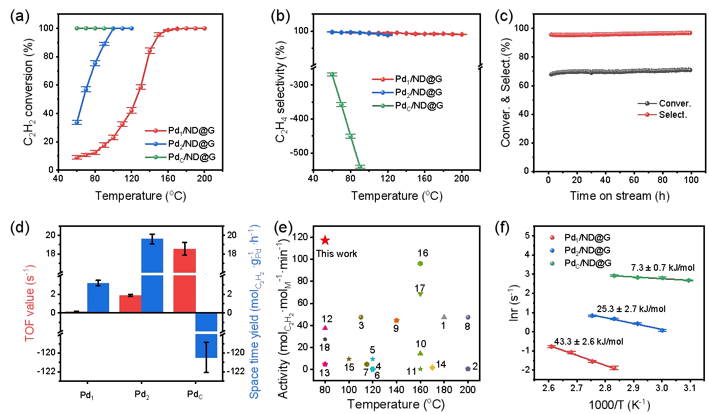 图2. 乙炔半加氢反应性能。(a)反应活性,(b)乙烯选择性,(c)长时间稳定性,(d)转化频率和时空收率,(e)比活性对比,(f)动力学活化能。