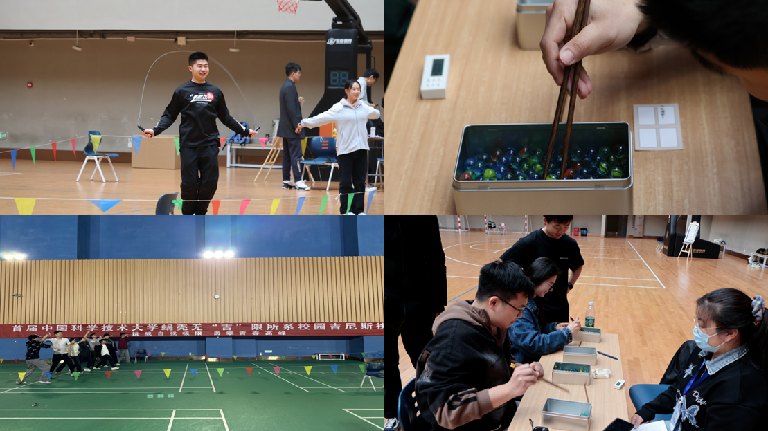 本次活动包含六个项目,分别在不同区域同时进行。“极速跳绳王”项目中,选手们在规定时间内展示了自己的跳绳技巧,单脚跳、双脚跳等多种方式让人眼花缭乱,其中来自环境科学与工程系的蹇鹏飞同学以每分钟211次的跳绳次数创下了男子组所系校园吉尼斯纪录,来自稀土学院的钱佳玲同学以每分钟195次的跳绳次数创下了女子组所系校园吉尼斯纪录;“弹珠夹夹乐”现场,选手们用筷子夹取弹珠,考验着手眼协调能力,先进技术研究院的王浚沣同学以一分钟夹取28颗弹珠的成绩刷新了所系校园吉尼斯纪录;“一纸越千里”则激发了大家的创造力,选手们用A4纸折叠出各种造型的纸飞机,力求投掷出最远的距离,工程科学学院的王腾同学折叠的纸飞机以30.8米的飞行距离创下了新纪录。
