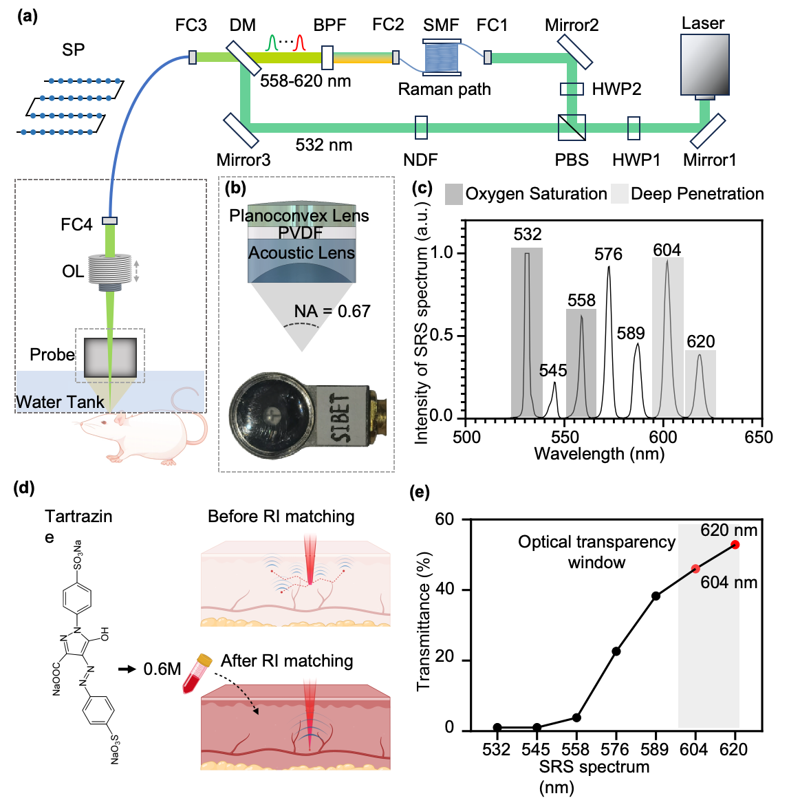 基于以上问题和挑战,中国科学院苏州生物医学工程技术研究所张雅超研究员团队推出高灵敏度多光谱光学分辨率光声显微镜(MW-OR-PAM),以“光源—探头—对比增强”三位一体设计,针对性化解瓶颈。包括(1)研制多波长高速切换光源(SRS-Fiber Laser Source)。基于保偏光纤的受激拉曼散射(SRS),以一台 532 nm 纳秒激光器扩展至 532–620 nm 可调输出,用于血氧成像的波长切换 <1 µs(亚微秒级),重频上限达MHz,覆盖高速活体成像需求。以通用绿光泵浦替代多台专用多谱段激光器,显著降低成本。(2)研制高灵敏度光声探头,以P(VDF-TrFE) 薄膜与光学透镜同轴布局,实现光激发/光声探测共轴,光声探头数值孔径达到 0.67,带宽 98.94%,光学透过率高达90%,在保持高分辨率的同时显著提升灵敏度与频谱覆盖,兼顾对比度与定量稳定性。(3)引入生物兼容组织透明化染料柠檬黄(Tartrazine),在 ≥600 nm 波段实现活体可逆透明化,定向提升红光通道的信噪比与有效成像深度,补齐多光谱血氧定量的“短板”。