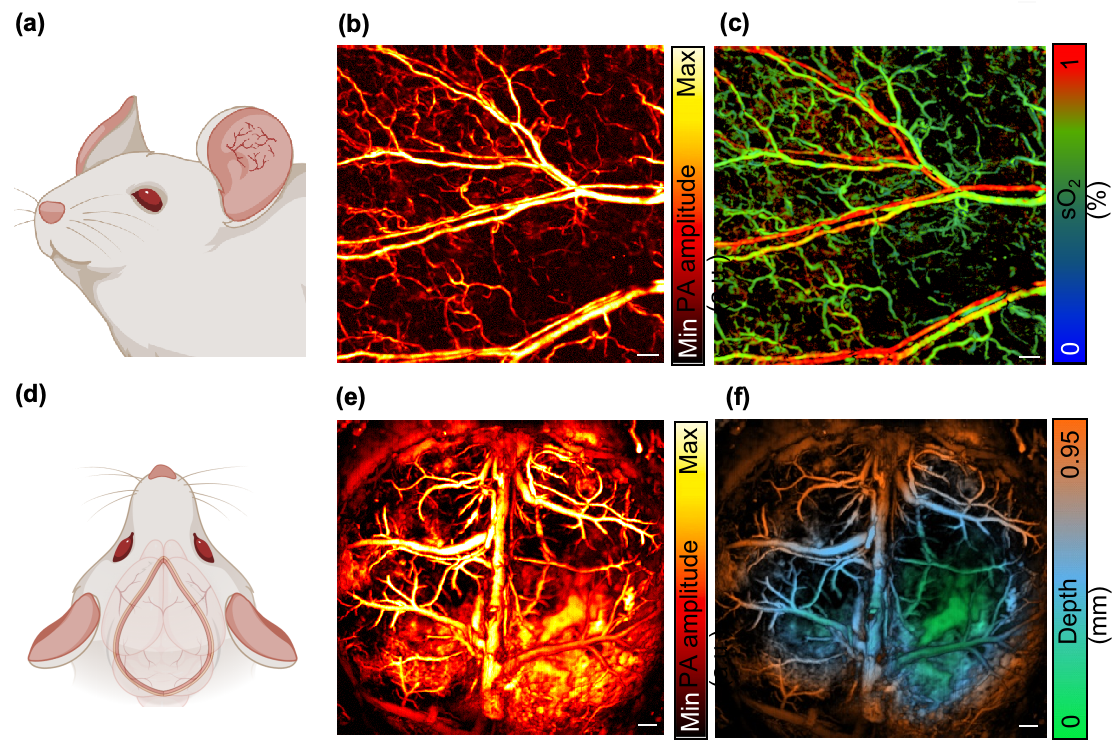 团队通过大量的活体实验,证明了MW-OR-PAM可实现高分辨率活体血管成像、血氧饱和度成像、经颅脑成像。MW-OR-PAM从绿光到红光的一体化谱段覆盖,兼顾结构-功能双重信息;MHz 级重频与亚微秒切换,有望让高速生理动态过程(血流/代谢/神经耦合)捕获更可靠;单泵源配合光纤SRS的方案与同轴探头设计,降低系统复杂度,利于复制与转化。