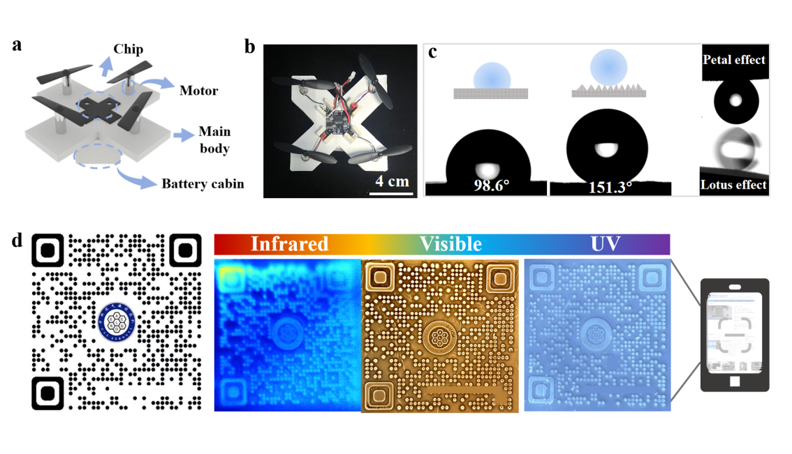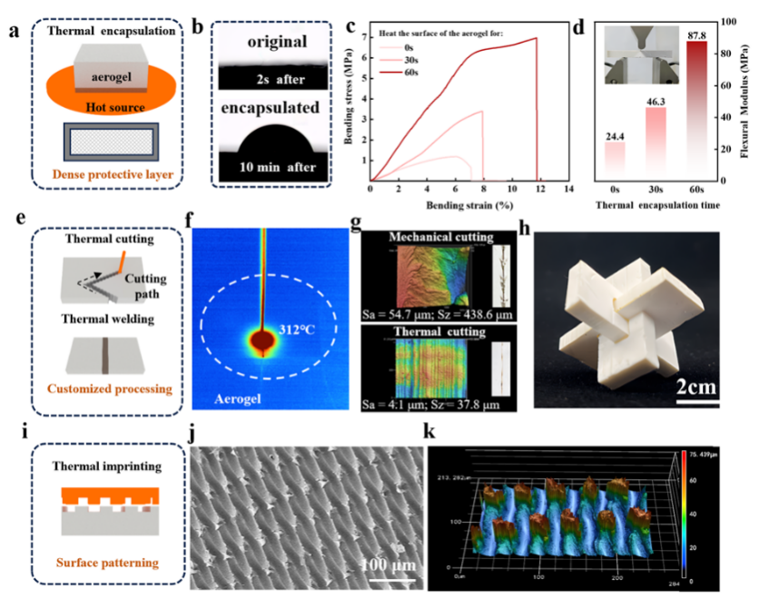 研究团队展示了多种热机械加工技术(图3,4):热封装:通过在气凝胶表面形成致密尼龙保护层,显著提升其机械强度与阻隔性;热切割与热焊接:可实现气凝胶的精准形状的定制化编辑与复杂结构(如无人机机身、鲁班锁)的装配;热压印:可在气凝胶表面构建微结构,实现超疏水(荷叶效应、花瓣效应)与荧光图案,应用于信息加密与防伪。