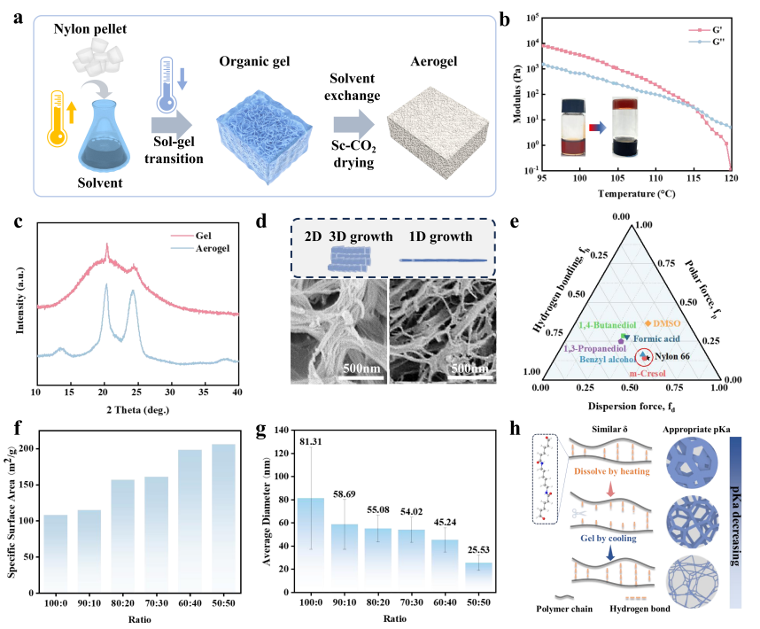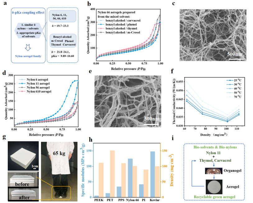 研究团队通过协同调控溶剂溶解度参数(δ)与酸解离常数(pKa),实现了对尼龙高分子在溶液中的结晶行为与自组装路径的精确控制(图1)。在合适的δ-pKa组合下,尼龙分子可沿一维方向自组装形成交织的纳米纤维骨架,从而构建出具有高比表面积(最高达226 m²·g⁻¹)、优异压缩模量(12.6 MPa)和超低导热系数(0.034 W·m⁻¹·K⁻¹)的纳米多孔尼龙气凝胶。