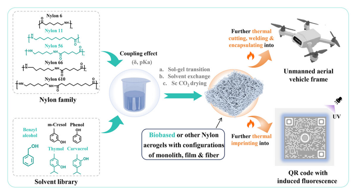 示意图:基于溶解度参数-pKa耦合效应构建的纳米多孔尼龙气凝胶家族示意图,展示其热塑性变形能力及伴随的荧光现象。