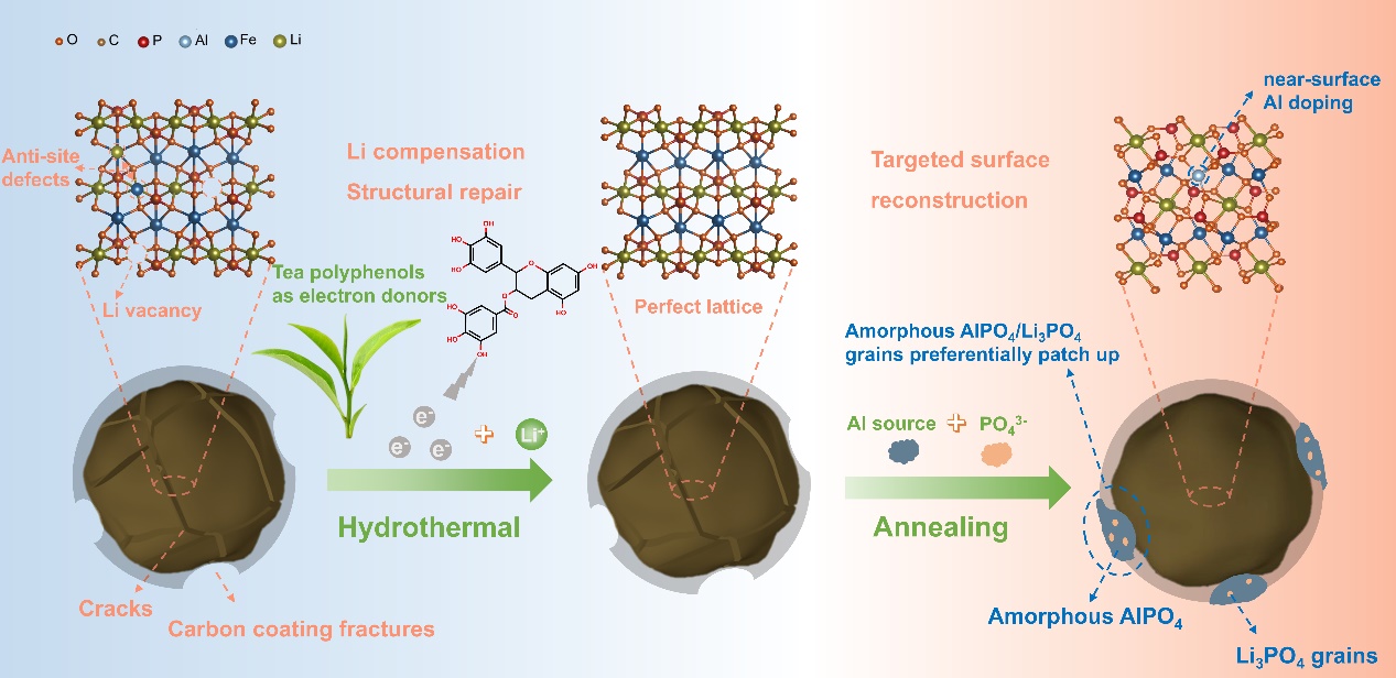 基于此,研究人员采用天然提取的茶多酚作为电子供体,利用其羟基电子供体与补充锂盐的共同作用,不仅将退役磷酸铁锂中衰退的FePO4相高效转化为LiFePO4,还可以有效减少材料中的有害Li-Fe反位点缺陷,进而实现退役磷酸铁锂材料在成分和结构上的修复,并重建Li+的快速扩散通道。同时,针对退役磷酸铁锂材料颗粒表面碳层的破损缺失问题,与通常无选择性地重新引入碳源构建新碳层的方法不同,研究人员通过在修复材料时引入Al源,利用磷酸铝与磷酸铁锂优先结合的特性,精准地在碳层破损、磷酸铁锂裸漏处形成由非晶AlPO4和Li3PO4晶粒复合的定向填补涂层,实现对退役磷酸铁锂表面破损碳层的靶向修补;涂层中的非晶AlPO4和Li3PO4快离子导体还可与残存的碳层在活性材料表面重构电子、离子双快速传输通道,有利于提高再生后磷酸铁锂的倍率性能。此外,引入的部分Al元素还会掺杂到LiFePO4体相中,在不影响磷酸铁锂正极材料能量密度的前提下,提升了活性材料结构稳定性,有效抑制铁离子再迁移,从而延长了磷酸铁锂正极的使用寿命。