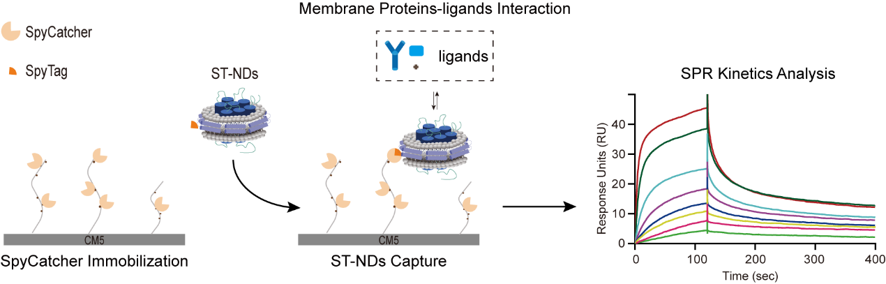 针对该瓶颈,研究团队创新性地将SpyCatcher-SpyTag共价偶联系统与膜支架蛋白(MSP)介导的脂质纳米盘技术相结合,开发出一种操作简便、高效稳定的膜蛋白芯片固定新策略。该方法通过柔性链接构建MSP-SpyTag融合蛋白,进而利用其将目标膜蛋白组装至脂质纳米盘内;所得的纳米盘携带SpyTag标签,能够与预先通过常规氨基偶联法固定于CM5芯片表面的SpyCatcher蛋白发生高效、特异的共价结合而被精准捕获,从而实现膜蛋白在近生理膜环境下的高效、稳定固定。