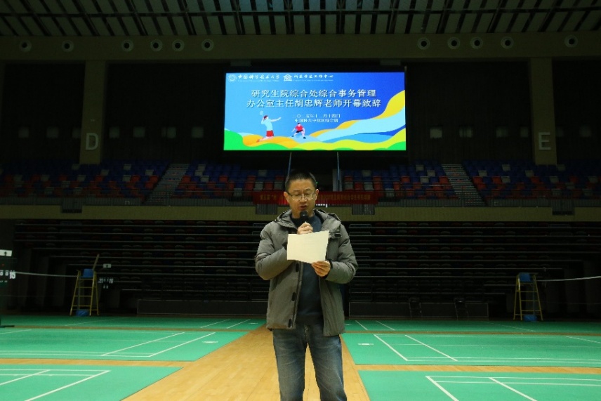 开幕式上,研究生院综合处综合事务管理办公室主任胡忠辉老师精彩致辞,寄语各位参赛选手能够赛出水平、赛出风格,更要赛出彼此之间的友谊与尊重。