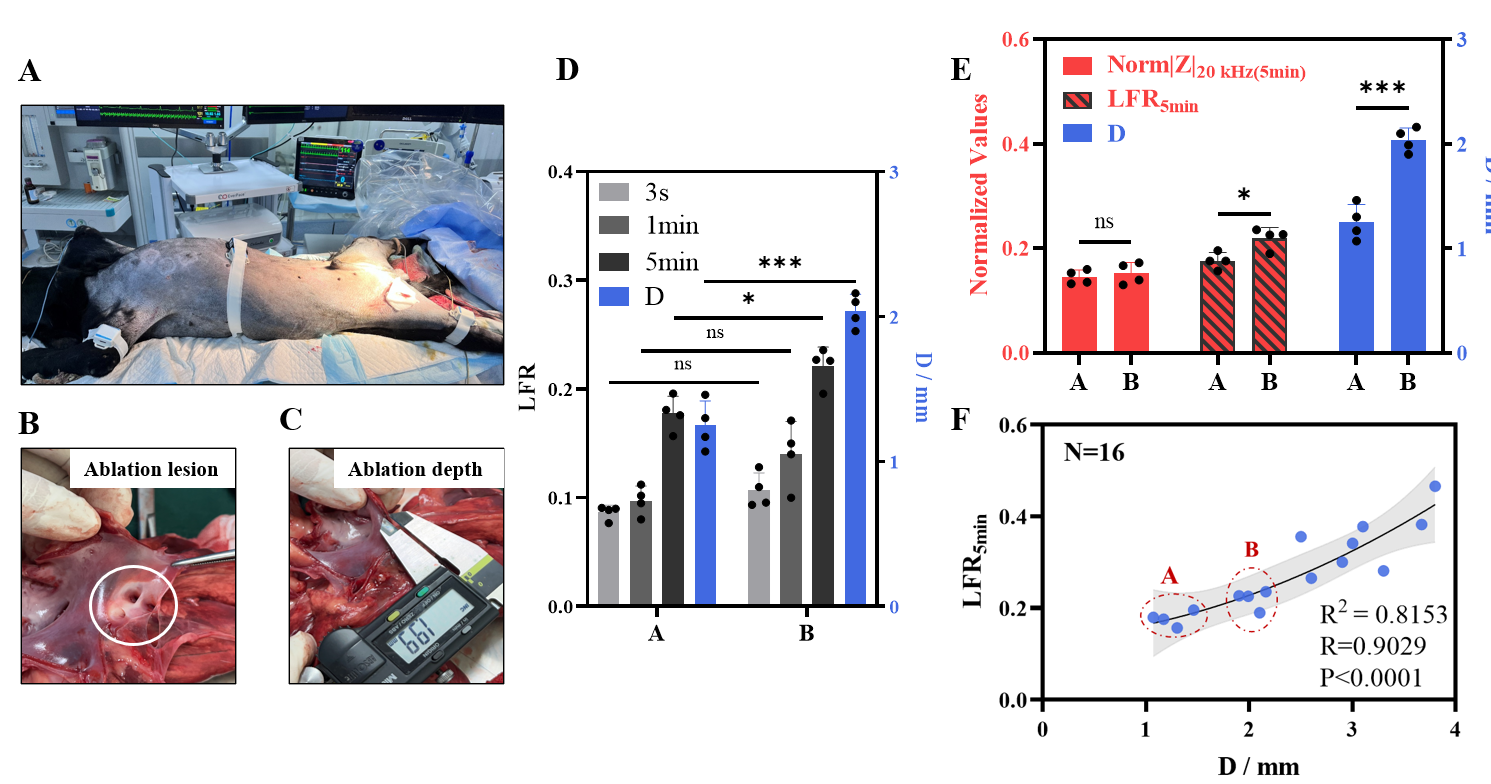 团队构建了完整的“体外-在体”验证体系。马铃薯体外模型实验显示,LFR5min与消融深度在1-9 mm 区间符合二次函数关系,在0-15 mm 全范围符合Gompertz 生长模型,揭示了从浅表到深部损伤的阻抗变化规律。进一步的犬心脏在体实验证实,该方法具有亚毫米级的检测灵敏度,成功区分了统计学差异仅为0.8 mm 的消融深度。该研究为PFA 术中深度的实时量化监测提供了理论依据和关键参数。