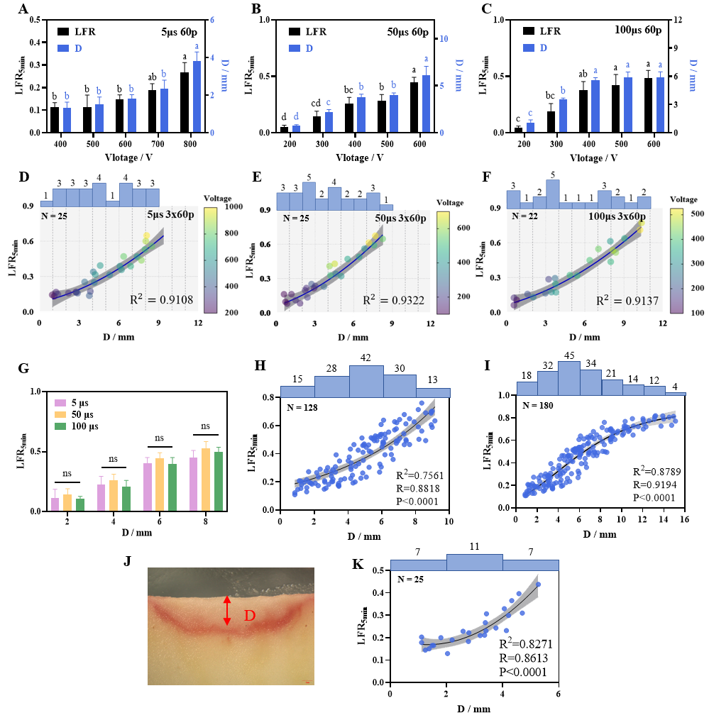 近日,苏州医工所庄杰研究员团队针对这一难题,提出了一种基于电阻抗谱的“低频电阻变化率(LFR)”量化评估方法。研究团队利用生物介电模型解析宽频阻抗数据,提取出能特异性表征组织电穿孔程度的LFR 指标。研究发现,相比传统单频阻抗,术后5 分钟的低频电阻变化率(LFR5min)能更准确地反映消融深度的动态变化,有效排除了可逆电穿孔的干扰。
