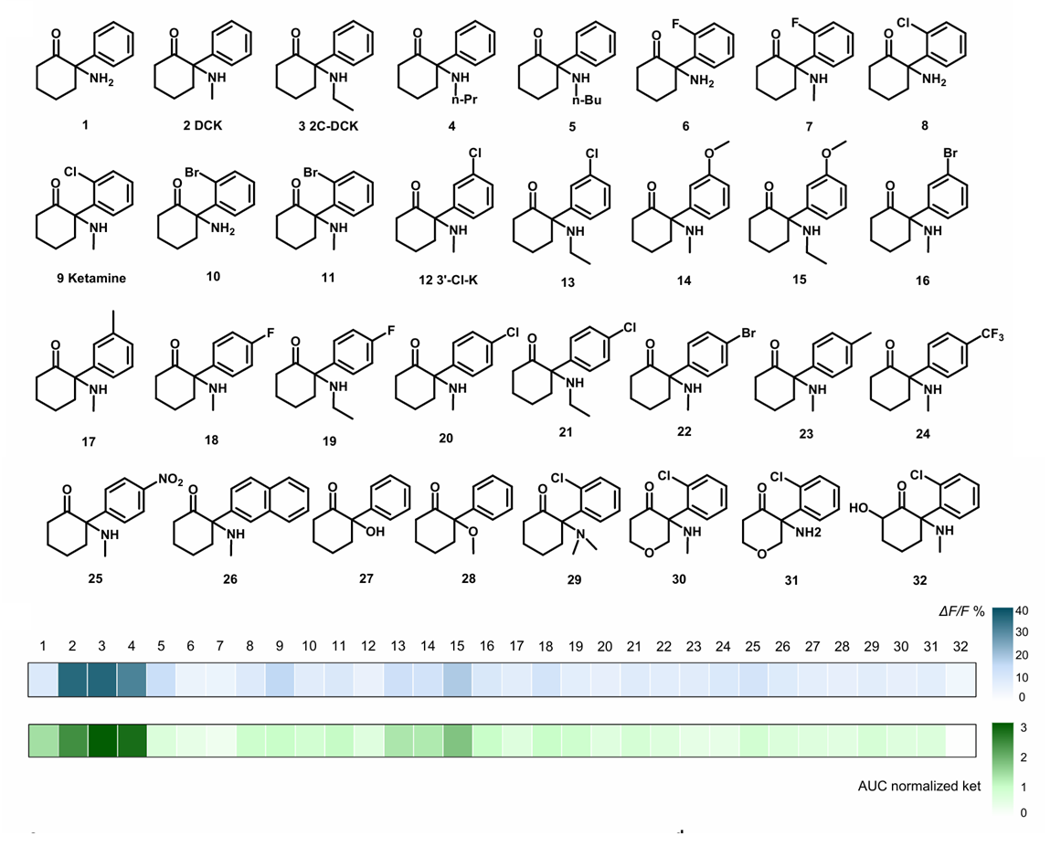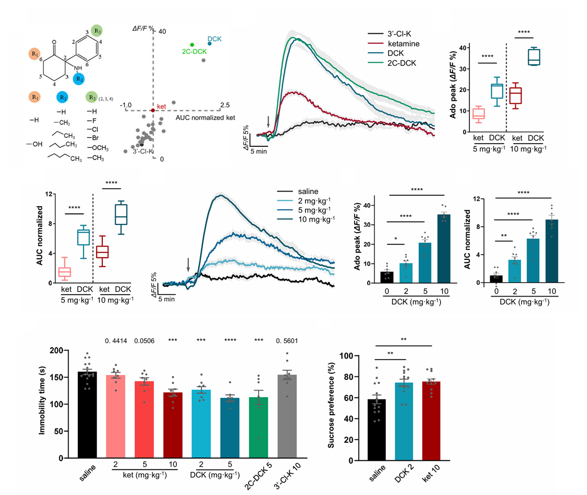 长期以来,氯胺酮的抗抑郁机制一直被置于NMDA受体拮抗的理论框架下进行解释——即通过阻断NMDA受体,引发下游谷氨酸能突触功能增强与神经可塑性重建。然而,随着临床与临床前证据的不断积累,这一以“细胞膜受体为中心”的经典范式逐渐显现出其解释力的局限。值得注意的是,作为一类典型的精神活性物质,氯胺酮在穿越血脑屏障进入中枢后,不仅作用于各类膜蛋白靶点,也必然广泛分布于胞内环境。研究团队发现氯胺酮通过直接调节细胞能量代谢,增加细胞内腺苷,内侧前额叶皮层腺苷信号是介导氯胺酮快速抗抑郁作用的关键信使。研究者以“增强腺苷释放”为表型指标,设计并筛选了一系列氯胺酮衍生物,对氯胺酮结构进行系统性改造,重点修饰其芳香环氯取代基、环己酮第六位及氨基侧链(图1)。其中,去氯氯胺酮在同等剂量下诱导的腺苷释放显著强于氯胺酮;去氯氯胺酮在极低剂量下即能诱发更强、更持久的腺苷信号,并在行为学测试中表现出优于氯胺酮的抗抑郁功效(图2),同时其引发的运动亢进副作用显著减弱。尤为重要的是,腺苷释放能力与NMDA受体抑制效应之间出现明显解耦,提示氯胺酮的抗抑郁作用并非完全依赖于NMDA受体阻断机制。
