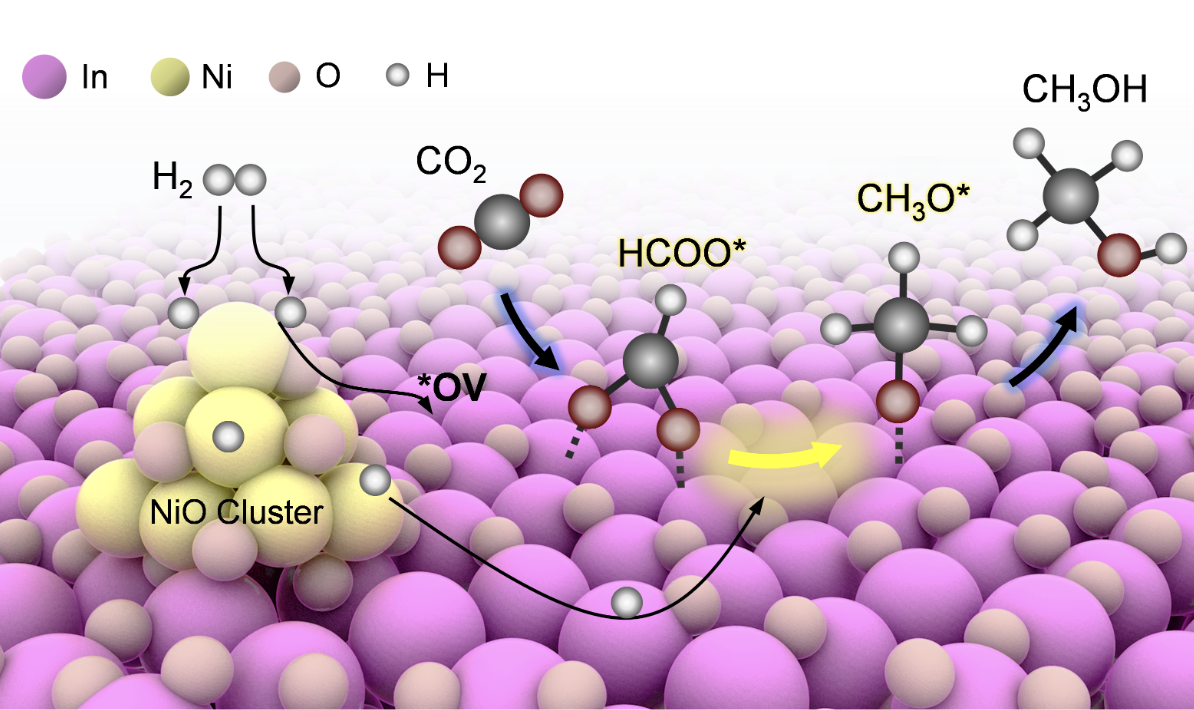 化石资源的持续消耗伴随大量二氧化碳向大气中的排放,加速全球变暖等环境问题。目前,降低二氧化碳排放同时增加二氧化碳的捕获和利用已成为一项紧迫任务。针对该问题,将二氧化碳转化为非化石来源的化学品如甲醇是一种重要的解决方法,因此开发高性能二氧化碳加氢催化剂以实现甲醇的高效制备已成为研究中关注的焦点。迄今为止,各种类型的甲醇催化剂,包括Cu/ZnO基催化剂、二元氧化物如ZnZrOx及MoS2基催化剂等已见诸报道。氧化铟(In2O3)由于其表面易还原形成活性OV位点特性,被证明是新一代甲醇催化剂。现有研究指出,催化材料表面负载Pt、Ni等具有较强活化氢能力的金属可以显著增强甲醇合成速率,但目前甲醇制备效率仍不高。