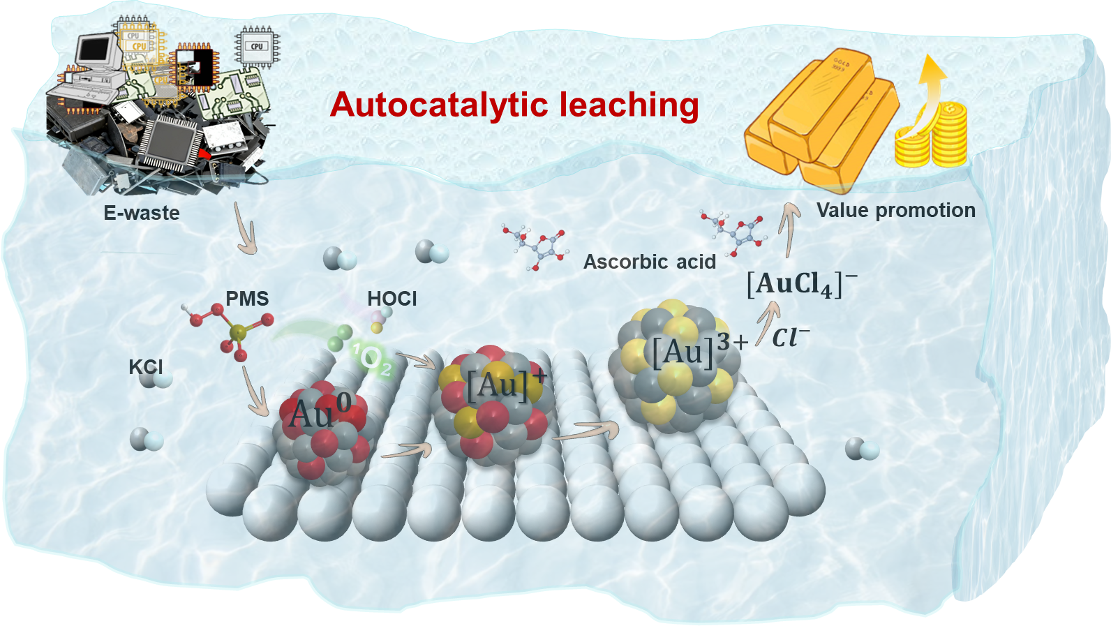 近日,广州能源研究所杨改秀研究员、袁浩然研究员联合华南理工大学陈燕教授在学术期刊Angewandte Chemie International Edition上发表了题为Green Recovery of Precious Metals from E-waste via Autocatalytic Leaching的研究论文。文中提出一种自催化浸出策略,使用过一硫酸氢钾(PMS)和氯化钾(KCl)混合水溶液,在无何外部催化剂的条件下实现贵金属回收。