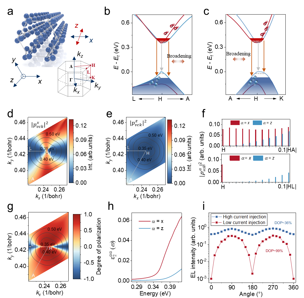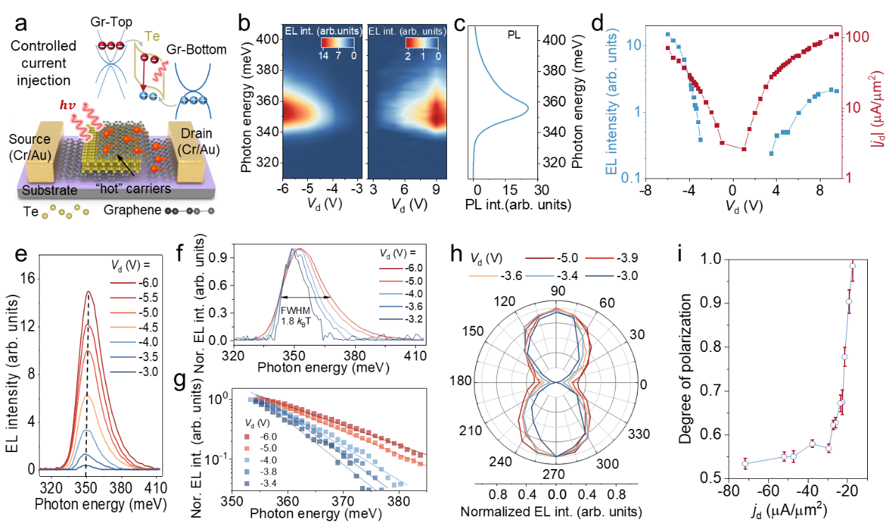 基于此独特物性,团队构建了石墨烯/碲/石墨烯范德华异质结中红外电致发光器件。该结构具有较低的寄生电阻,能够在较宽的电流密度范围内高效工作。实验发现,在低电流注入下,载流子主要在布里渊区H点(即外尔节点所在处)附近复合,发射出偏振度接近100%的高度线偏振光。随着注入电流密度的增大,高能“热载流子”效应显著,载流子复合区域在倒空间中从H点向外扩展。此时,不同动量点对发光偏振的贡献发生变化,导致器件的整体发光偏振度从~100%连续调谐至36%。第一性原理计算进一步证实了偏振可调性源于外尔节点附近的能带填充效应及热载流子主导的跃迁重分布。