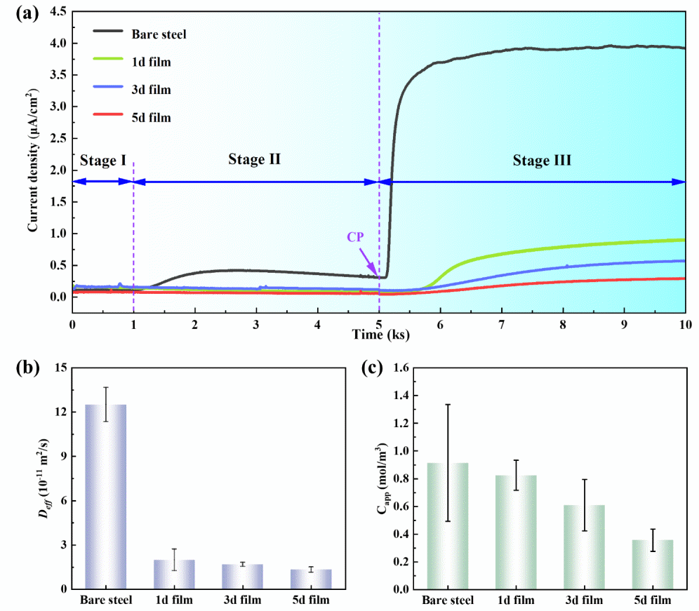 图2. 微生物腐蚀产物膜覆盖下 X80 钢的氢渗透行为:(a) 在 −1.1 V vs. SCE 阴极极化条件下的氢渗透电流密度–时间曲线;(b) 有效氢扩散系数(Deff);(c) 表观氢浓度(Capp)