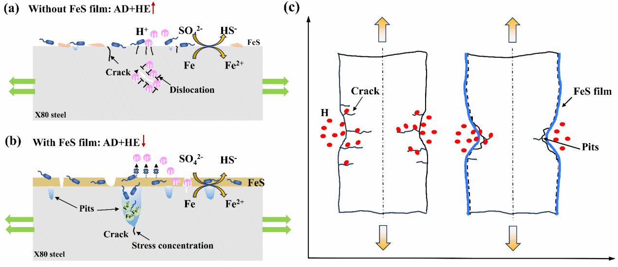 图4. 生物FeS膜在 SRB 环境中调控X80钢应力腐蚀开裂的机理示意图