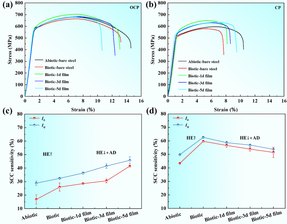 图3. 微生物腐蚀产物膜覆盖下 X80 钢的应力腐蚀开裂敏感性测试结果:(a, c) 无阴极保护(CP)条件下 X80 钢的应力–应变曲线及 SCC 敏感性;(b, d) 在 −1.1 V vs. SCE 阴极保护(CP)条件下 X80 钢的应力–应变曲线及 SCC 敏感性