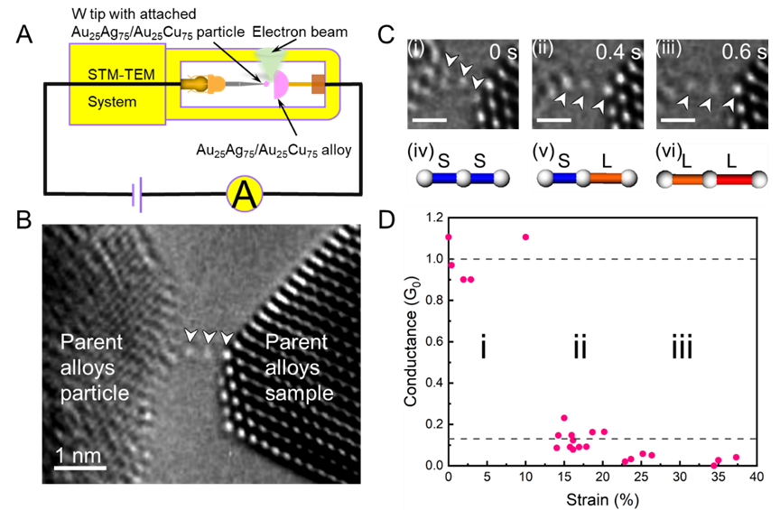 金属键作为决定金属及合金物理化学性质的核心,其变形行为对于材料的性能设计及应用至关重要。其中,单原子金属链作为最简单的一维结构,能够通过直接的键长变形来响应施加的应力,是探究金属键伸长机制的理想模型。迄今为止,受限于实验技术,金属键长的拉伸应变通常不超过10%,且呈现为线性响应的特征。然而,高应变条件下金属键长的变化行为及其对于材料物理性能的影响,长期以来始终未能明确。