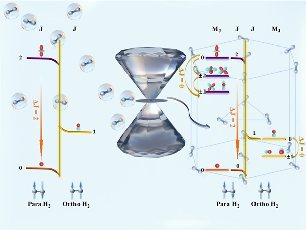 图1. ΔJ = 0的产生机理。左半部分是氢分子气态/流体态时转动能级图,右半部分是加压后发生固化的能极分裂示意图