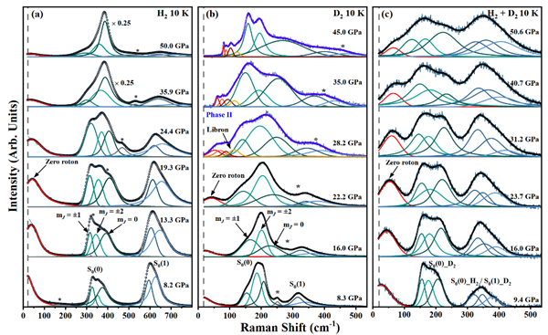 在此基础上,研究团队对系统进行进一步优化,对高压稠密氢(H2)、氘(D2)及其混合物开展了系统的压力-温度拉曼光谱测量,首次明确观测到了ΔJ=0这一“被藏起来的”激发信号。研究发现,在气态时,该激发拉曼位移为零;但在固态中,该激发拉曼位移偏离了零值。在约25 GPa、10 K条件下,氢、氘及其混合物分子的拉曼位移均出现在约50 cm-1处。这一现象表明ΔJ = 0跃迁频率不依赖于同位素质量,其拉曼激发来源于同一个转动能级间的跃迁,是一种区别于传统谐振子与量子转子的全新激发模式,突破了常规认知。