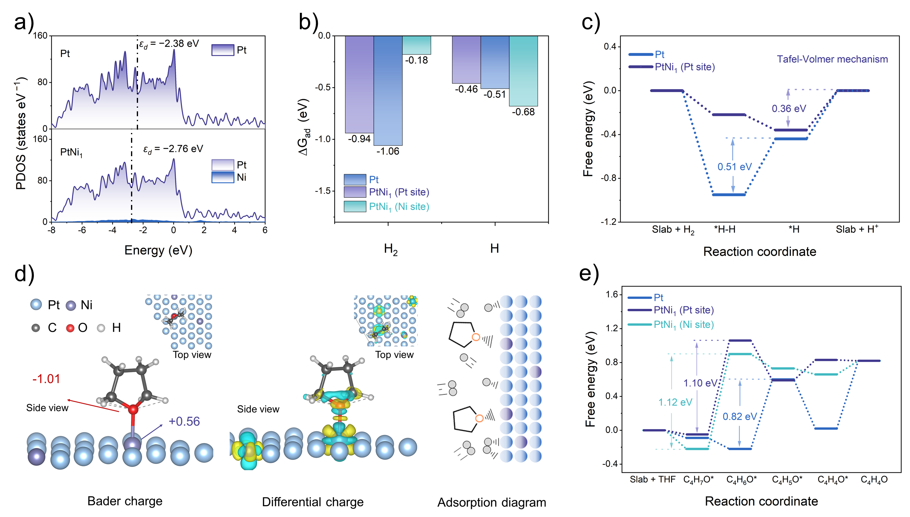 PtNi1电催化剂不仅实现了高效的HOR过程(图1a),且表现出了远优于商业Pt电极(图1b)的抗毒化性能,在THF电解液中实现了近100%的HOR法拉第效率(图1c)和超1000小时的稳定性(图1d)。团队提出镍单原子主要通过“配体效应”优化Pt位点的电子结构(图2a),以促进H*脱附步骤(图2b),有效降低了决速步的能垒(图2c);同时作为“协同位点”,改变THF吸附构型(图2d),提高了THF氧化分解能垒,从而抑制Pt位点上发生溶剂氧化反应(图2e)。将该阳极过程与锂介导氮气还原反应耦合,可在流动反应器中连续进行合成氨反应,并在40mA cm-2电流密度下实现56.6%的氨法拉第效率和7.77nmol s-1 cm-2的产率,其能耗较传统“牺牲溶剂法”降低约42%。得益于上述的性能优势,该催化电极可直接应用于分布式绿氨制备、氢-氨耦合储能、非水系燃料电池等能源存储与转化技术。该催化剂设计为有机电解液体系中的抗毒化提供了新的解决方案。