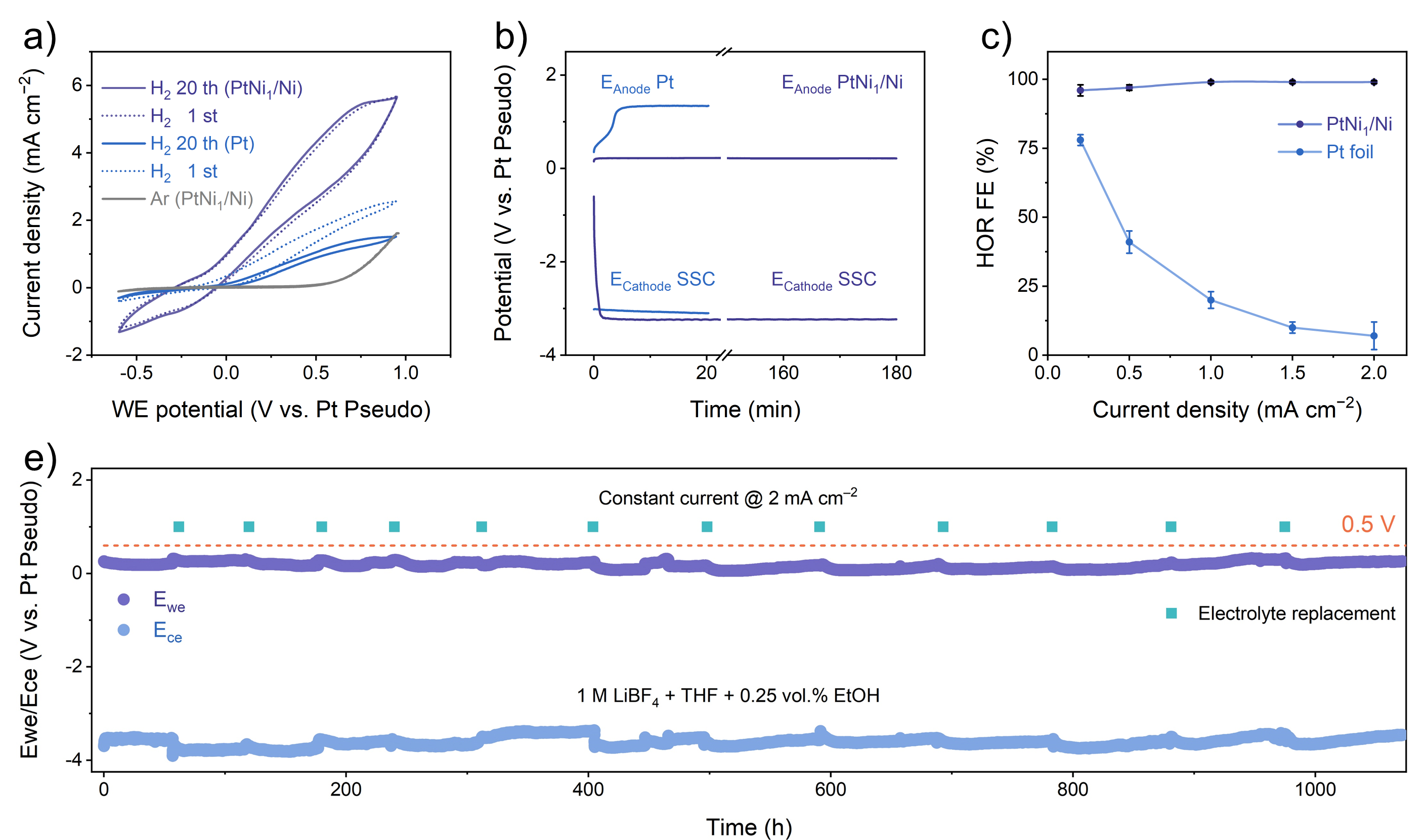 针对上述挑战,研究团队设计并合成了镍单原子表面调控的铂基催化剂(PtNi1),利用Ni单原子对Pt催化剂进行电子结构调控,优化氢中间体的吸附-脱附行为,加速HOR本征动力学。构筑对THF强吸附的Ni单原子中心,优先吸附竞争性有机分子,避免毒化Pt位点。得益于氢气氧化动力学的提升和对溶剂氧化副反应的抑制,系统选择性与稳定性大幅提升。