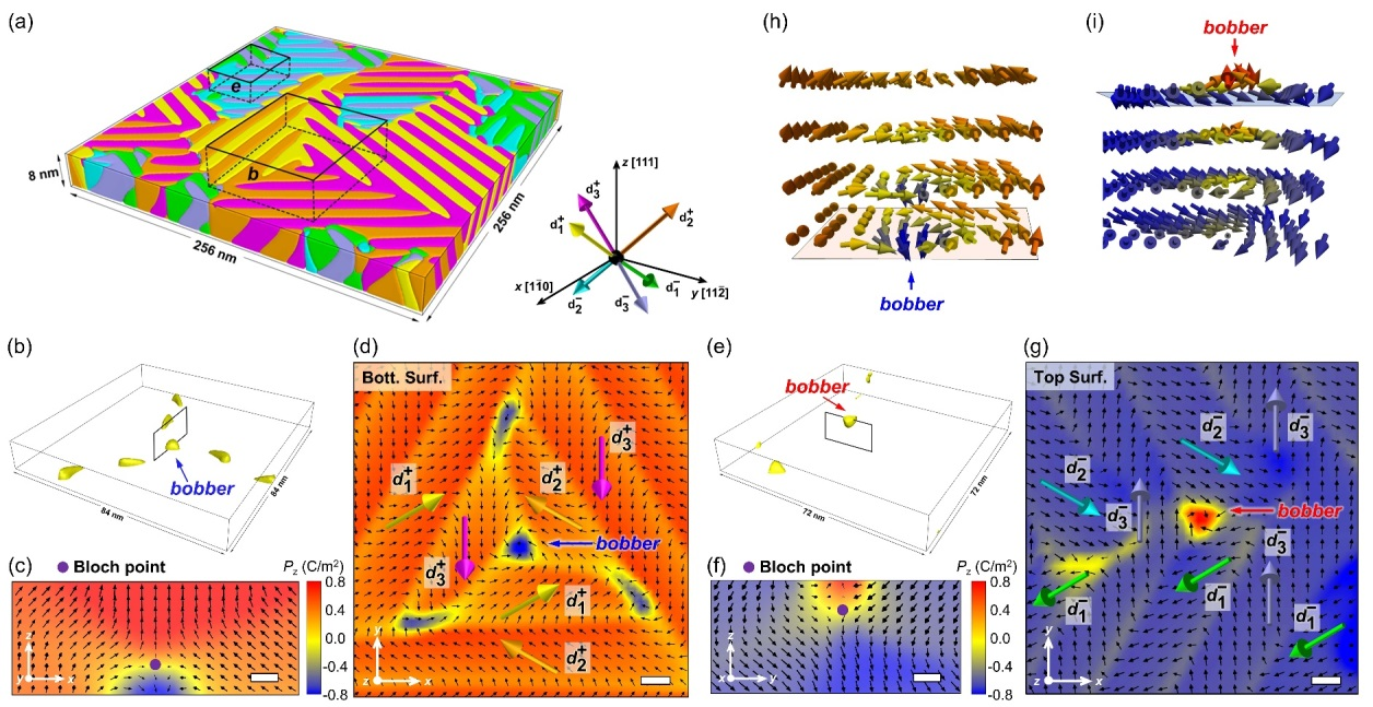 研究团队结合相场模拟与像差校正透射电子显微学等手段,在(111)取向的超薄 PbTiO3铁电薄膜中预测并实验证实了极性手性浮子的存在。该结构是一种三维极性拓扑结构,其特征为一个面外极化与周围相反的纳米畴,起始于薄膜表面终止于薄膜内部的布洛赫点,同时在其周围形成面内涡旋态,呈现出类似磁性体系中“浮子”结构的三维极化特征。面内涡旋与面外极化的组合使极性浮子表现出手性。