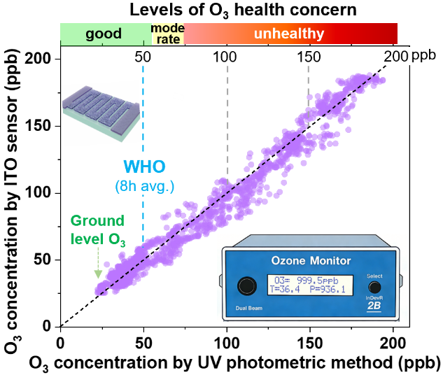 图1. 自加热ITO传感器与光学臭氧检测仪性能对比