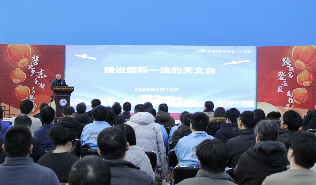 2月10日,中国科学院紫金山天文台召开专题会议传达学习中国科学院2026年度工作会议精神。台领导班子成员、党委委员、纪委委员、中层干部、研究部负责人、党支部书记、科研骨干及职工代表近300人参加会议。会议由党委副书记、纪委书记蔡华伟主持。