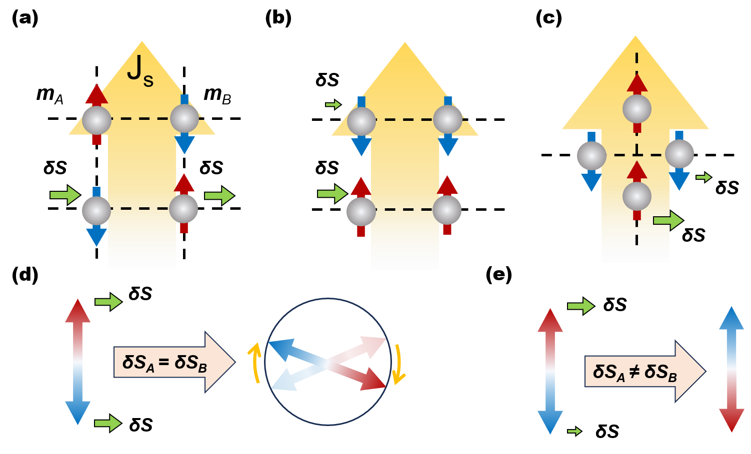 图1. 反铁磁体系中非对称自旋力矩(Asymmetric Spin Torque)的物理机制示意图。结合实空间子晶格的堆叠特性与界面截断效应,注入自旋流在反铁磁A、B子晶格上可以呈现出不平等的自旋积累现象。由此产生的非对称自旋力矩有效打破了动力学平衡,驱动奈尔矢量实现确定性翻转